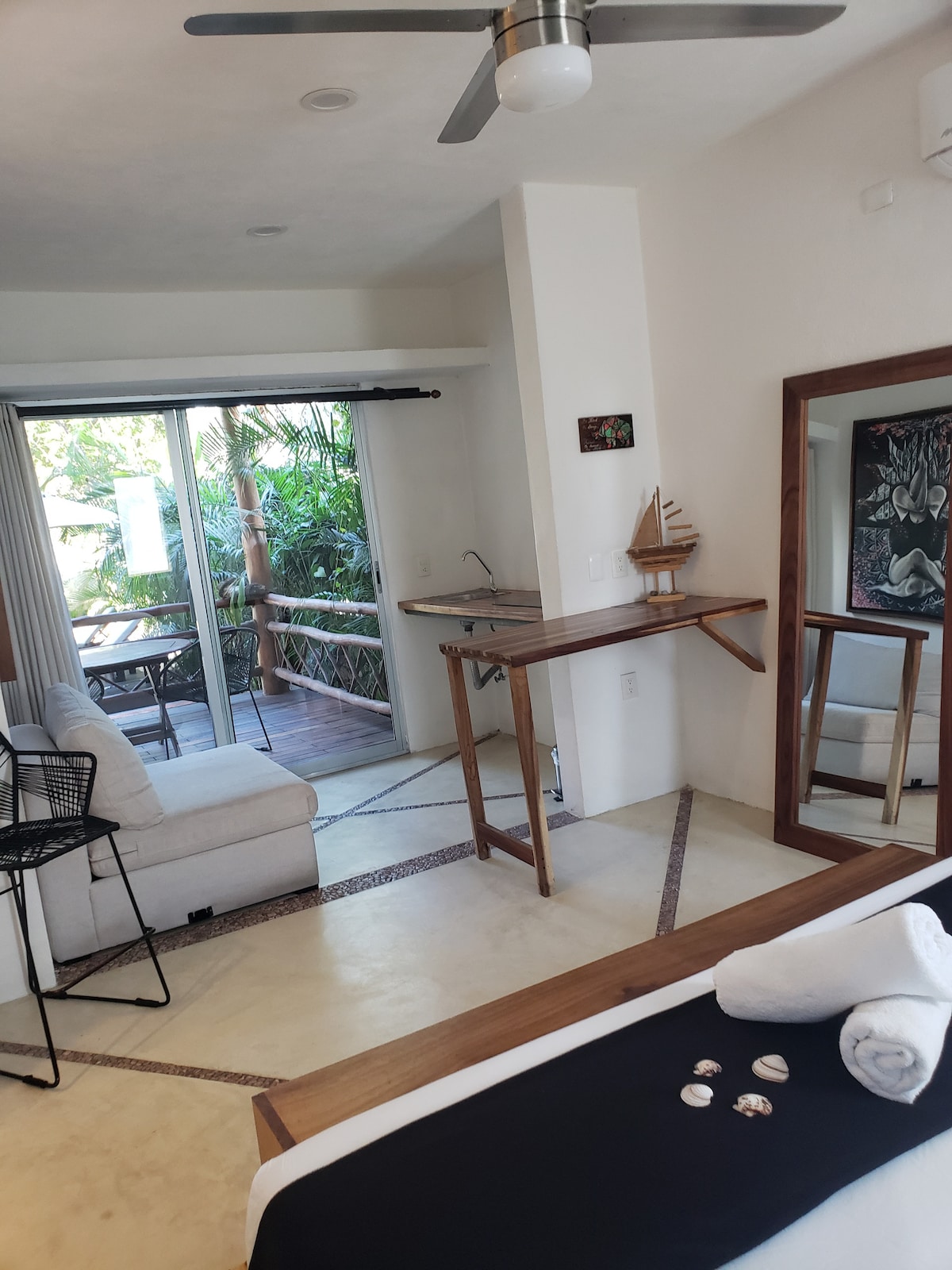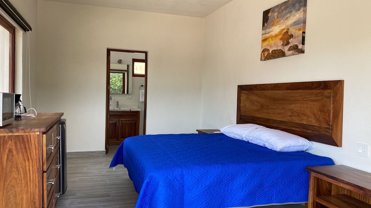 Esta habitacion, es ideal para 2 personas que no desean comparitr cama, una lugar comodo y bien ubicado, al ser un hotel pequeño, con accesos inteligentes, te dara la impresion de estar en tu propio lugar cerca del pueblo, para que puedas explorar las playas y restaurantes, y regresar por la noche a tu comodo cuarto. Este cuarto esta en planta baja por lo que es amigable para persona que prefieran no subir escaleras.