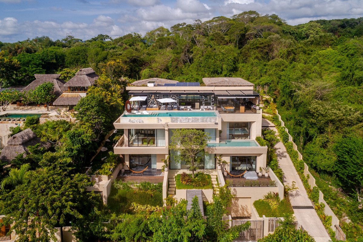 Discover the essence of Punta Sayulita in this 4-bedroom villa and 4.5 Bathrooms, surrounded by lush greenery. With spacious terraces and an organic design, Casa Escondida blends seamlessly with its surroundings.Wood and stone interiors create a warm and inviting atmosphere. The state-of-the-art kitchen, dining area, and living room with panoramic windows provide a seamless connection to nature. Relax on the terrace with comfortable sofas, enjoy the private pool, and dine under the stars.