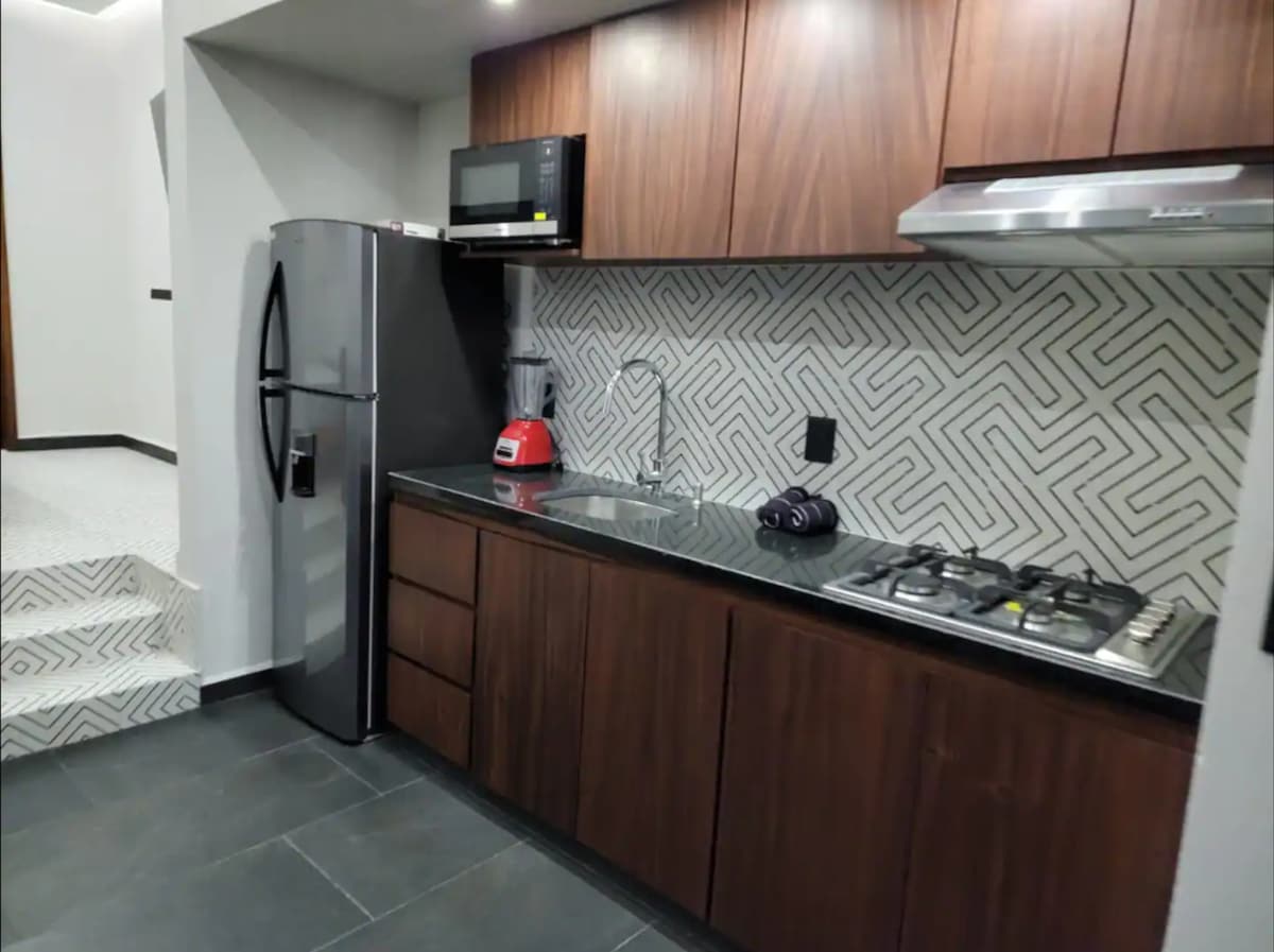 Punta Mita, Nayarit Departamento entero 38 m2 A 40 km del Aeropuerto de Puerto Vallarta, a 15 minutos de Sayulita y La Cruz de Huanacaxtle. Cuenta con dos camas tamaño Queen, A.A, cocineta equipada, agradables áreas comunes con un pequeña alberca, espacios para el descanso y relajación. A dos cuadras de la playa, cerca de los mejores puntos para surfear y demás experiencias cerca de las mejores playas . Punta Mita ofrece gran variedad de restaurantes para disfrutar frente o cerca del mar.