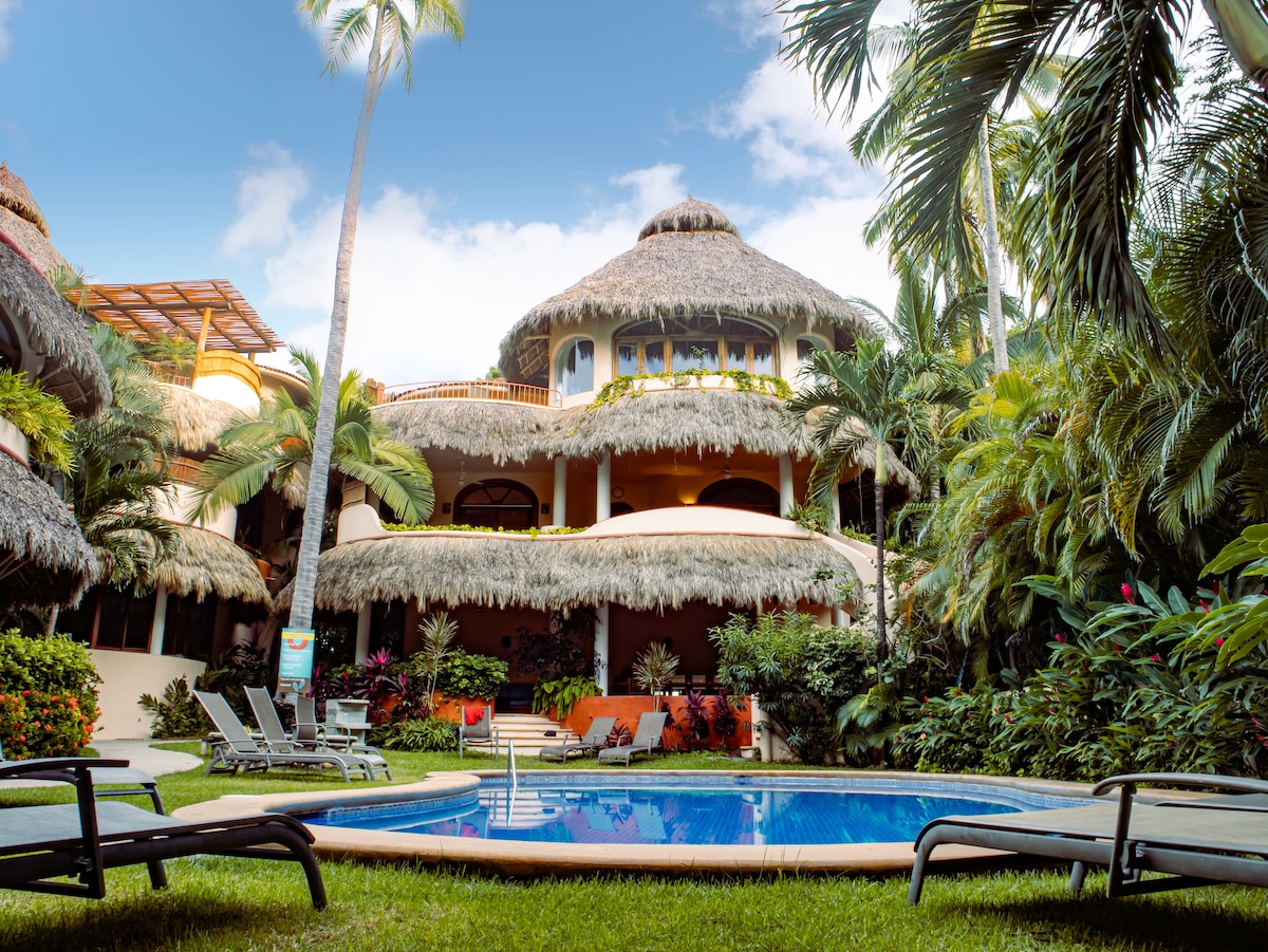 A ocean-view, modern and fully equipped 3 bdr, 3 bath terraced condo in a lush safe complex--1 block from the clean uncrowded side of Sayulita beach. Infinity pool w/ ocean view; high speed fiber optic wifi, the only tennis court in Sayulita; a private shady roof terrace & outdoor kitchn w/ surfbreak and Monkey Mountain vviews, 65"TV, a/c, indoor kitchn, washer/dryer, dedicated car parking spot, house golfcart with in-complex parking for rent, solar powered--3min walk to beach and 10min to town
