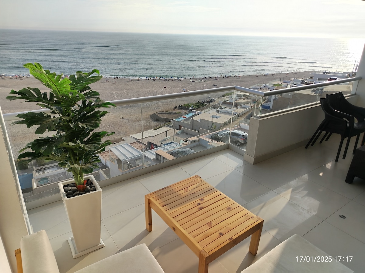 Fifth-floor apartment with a beautiful panoramic view of the sea and best location in Punta Hermosa. It has a total area of 130 m2: 115 m2 indoors and a 15 m2 terrace with a grill. There is a heated pool 1.4x1.9 mts. 4 bedrooms & 3 full bathrooms. It has a fully equipped gas kitchen with a microwave, electric oven, 450-liter refrigerator, and complete kitchenware and dining area for up to 10 people. 2 mobile desks, a spacious dining area, and high-speed WiFi available.