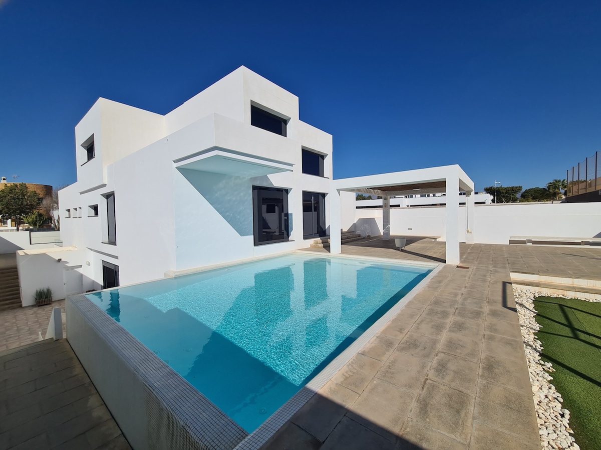 Apartment on the beachfront very well equipped. Pool. Sea views. Private parking, WIFI, air conditioning and heating ducts. Gym. Tennis and paddle tennis courts at no extra cost. Exit to the direct beach. Prime videoTV. Ideal for working from home. Quiet urbanization next to the natural area of Punta Entinas. To walk along the beach and very close to the golf course. In winter, indoor-pool.