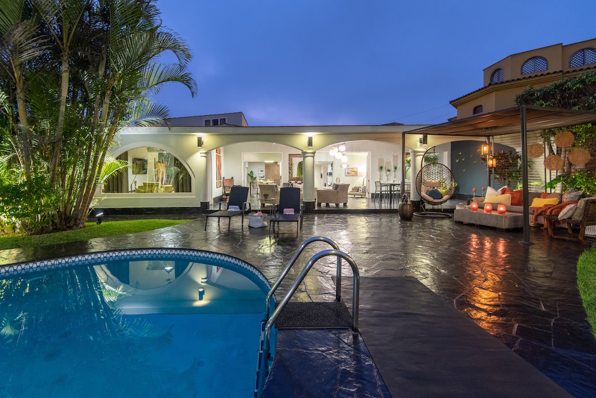 Experience the perfect blend of design and comfort in our spacious home. Newly renovated bathrooms, multiple outdoor living areas and lush gardens, ideal for birdwatching. Nestled in a sunny, tranquil area of Lima with exclusive access to all amenities, a well-equipped kitchen, pool, & reliable WiFi. Walk to markets, coffee shops, restaurants, pharmacies, and more. Whether you're seeking relaxation or entertainment, our home provides the ideal retreat for your stay in Lima.
