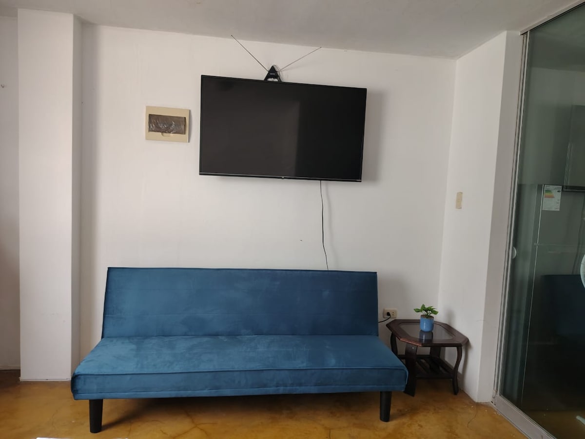 Monoambiente práctico y veraniego a 5 min de la playa. Pequeño pero funcional, con una cama de 2 plazas y otra de plaza y media, comedor, refrigeradora y cocina equipada con menaje. Tiene buen WiFi y un espacio cómodo para home office. baño privado con toallas y artículos básicos como shampoo y jabón. Zona segura y tranquila, muy cerca a nuevo mall del Sur, restaurantes, bares y transporte. Ideal para estancias largas, estudiantes o quienes buscan un lugar económico cerca del mar.