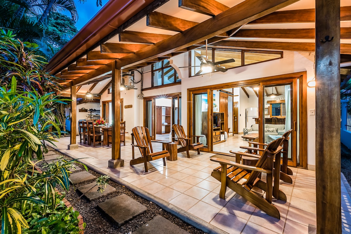 Beautiful 3 bedroom guest house within a gated development of Hacienda Pinilla and located in the exclusive beachfront private community of Avellanas,just steps from Avellanas beach.Quiet,calm and only 15 minutes from Tamarindo beach town. Plumeria Guest house is a two level,three bedroom home with full A/C uniquely designed to feel submerged in nature while being only 60 feet from the beach and close distance to surf breaks, Lola’s and Beachclub