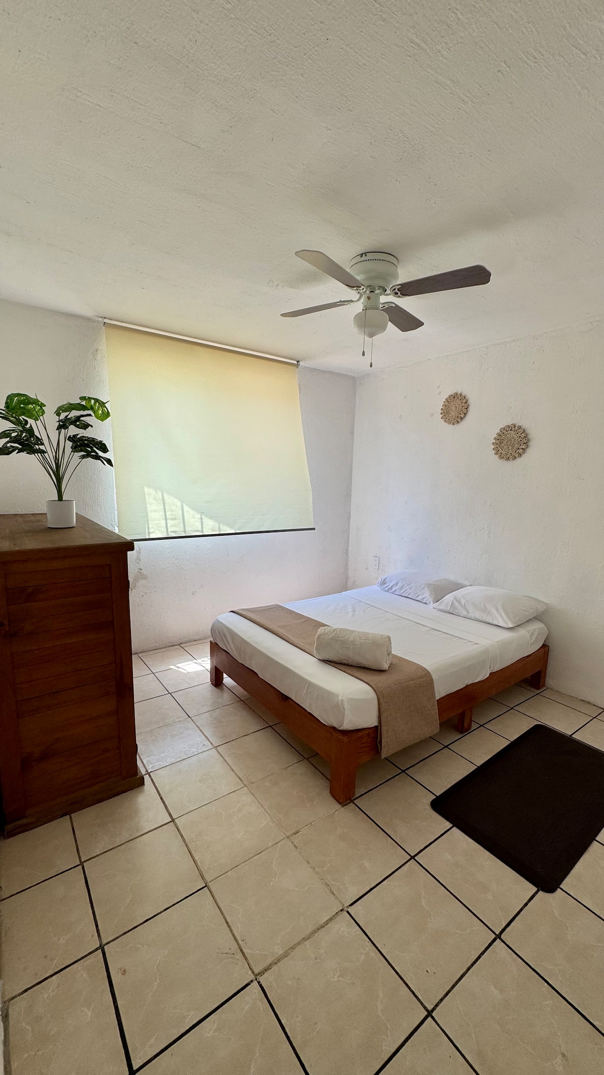 El depto (50m2) es parte de un condominio mediano, en el Fracc. Las Playas. A 5 minutos en coche del Club de Yates y de la Playa de Caleta. Con vista panorámica; tranquilo y seguro. Tiene 1 habitacion con una Kingsize y en la sala con una cama individual y dos colchonetas. Tenemos cocina y comedor. La terraza y la alberca son de área común. Notas: 1. No tenemos aire acondicionado, pero ventiladores sí 2. Antes de reservar revisa muy bien si la ubicación es idónea para ti.