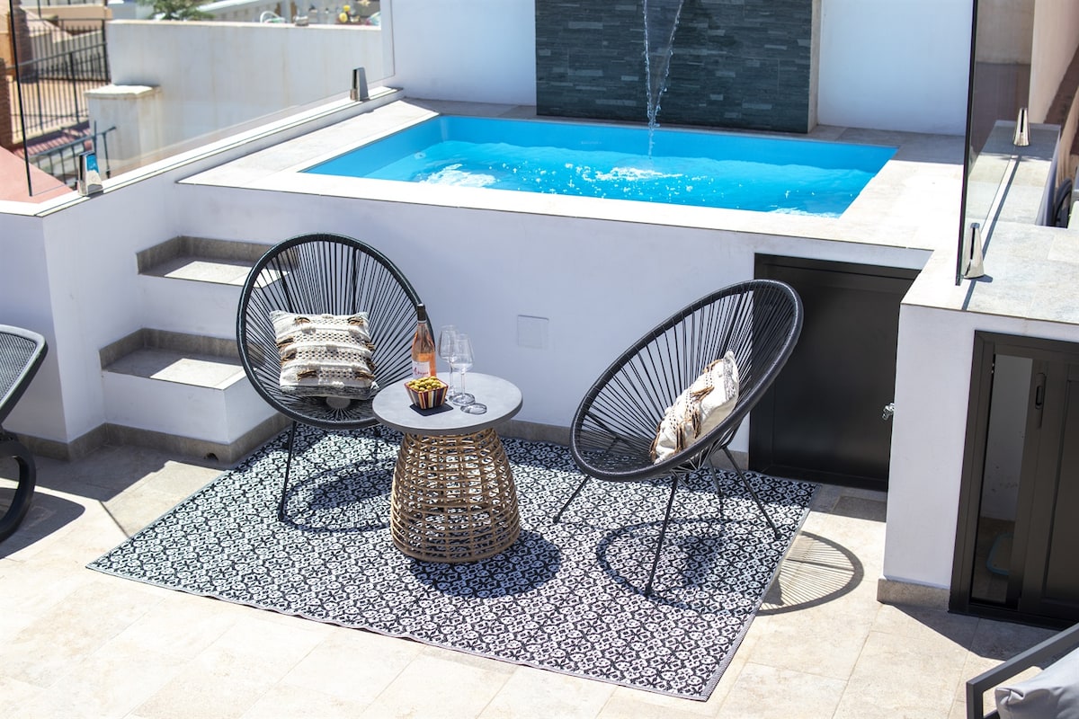 What stands out about this home is the private roof terrace with panoramic views and a private pool with sun loungers. The apartment (60m²) is completely new; perfect for a romantic getaway for two. It has a bedroom, a bathroom and an equipped kitchen. From the living room there is access to another terrace/balcony, from which you can enjoy wonderful mountain views. There is free parking in the street and it is just a ten-minute walk to the centre of Frigiliana; Nerja is a 10-minute drive away.