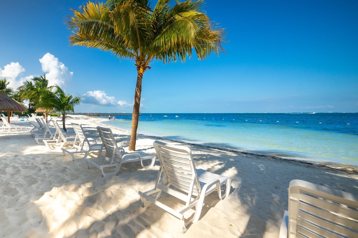 Cosy & well located private studio, with equipped kitchen, in front of the beach in Cancun Hotel Zone. Enjoy your time by the beach and the amenities included: Private access to the beach and the complex amenities such as 2 Pools, 2 Jacuzzis, Kids water area, daily activities. At a special price for our guests, we do provide shuttle a service to or from the airport.