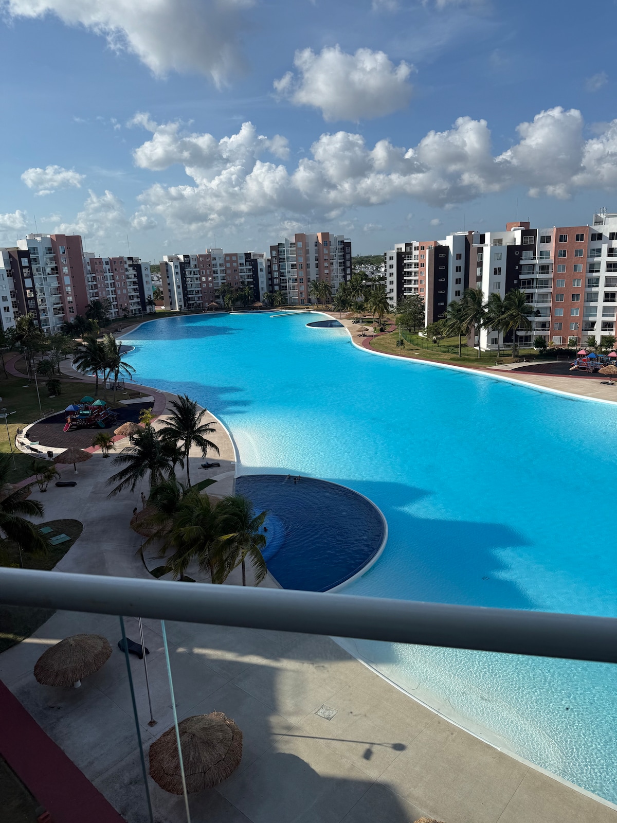 Apartamento hermoso, limpio y exclusivo para cada grupo de hospedaje. Balcón, terraza, 3 recámaras. 2 baños. Con vista espectacular a la laguna (artificial), 7 albercas, jardines. Seguridad 24/7. Estacionamiento, Wi Fi, Aire Acondicionado, Ventiladores, 2 Smart T.V. , Netflix, Lavadora, secadora, plancha, secador de pelo, Caja de seguridad, etc. Supermercado, Tiendas de conveniencia, Cafeterías, gasolinera, restaurantes y bares, servicio de Emergencias, ATM, a 3 cuadras del Complejo.