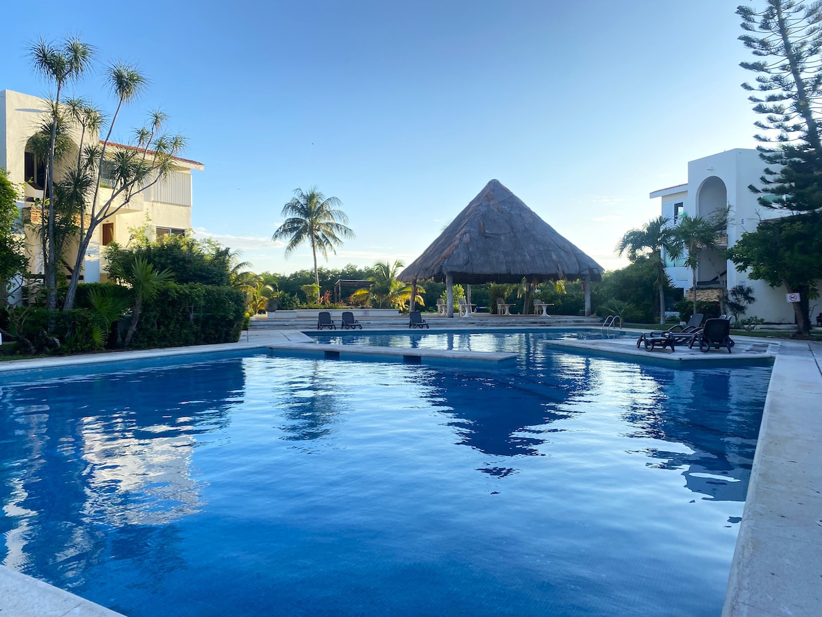 sencillo y agradable departamento vacacional se encuentra en segundo piso. Tiene una cómoda ubicación cerca de playas, Zona de bares antros (10 min en autobús) , farmacias, supermercado, tiendas de conveniencia y casas de cambio. Disfrutarás de una bella y relajante vista hacia una hermosa laguna donde podrás disfrutar de bellos atardeceres. El departamento no cuenta con alberca sin embargo a tan solo 5 min a pie encontrarás la playa con aguas cristalinas tranquilas y de poca profundidad.