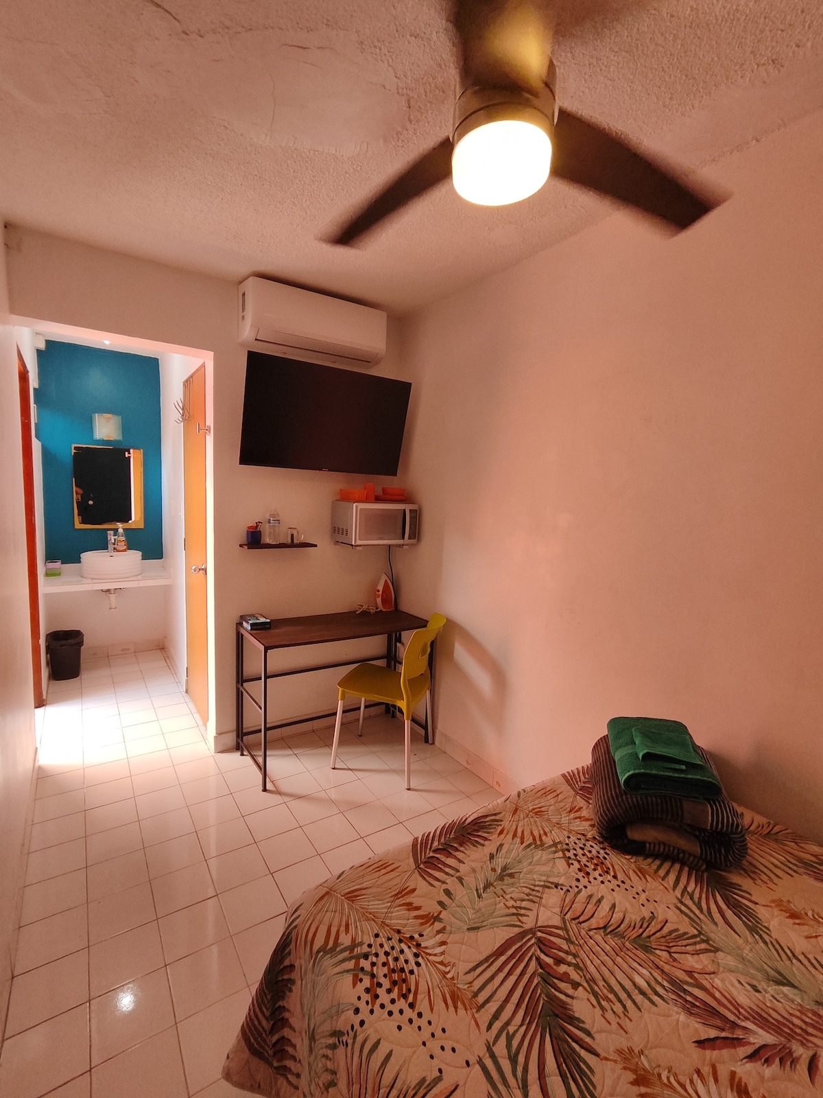 Limpieza profunda antes de cada reservación y desinfectada con producto certificado por COFEPRIS. Dispensadores de gel antibacterial en las áreas comunes. Espacio cálido y hogareño, con servicios para permanecer estancias largas y sentirte como en casa. Cuenta con una cama matrimonial, baño propio, aire acondicionado, closet, cocina equipada con cafetera, parrilla eléctrica, refrigerador, vajilla, microondas y plancha. NO CONTAMOS CON ESTACIONAMIENTO