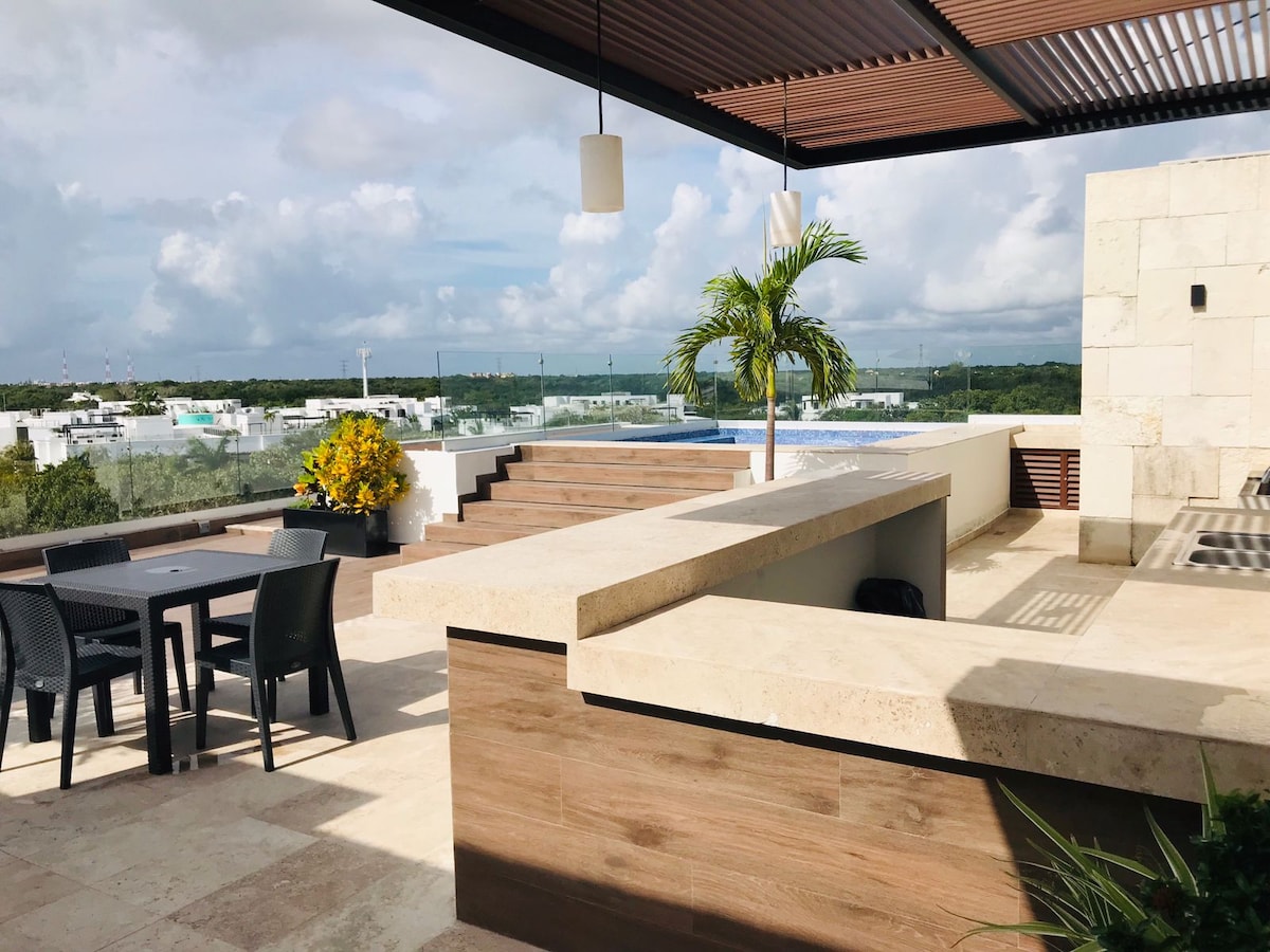 Hermoso departamento ubicado en unas de las zona más exclusiva de Playa del Carmen, muy cerca de la playa, a la cual podrás accesar y disfrutar de diferentes Beach Clubs Privados, rodeado de naturaleza, alejado del estrés de la ciudad, haciendo de éste un lugar perfecto para unos días de relajación y disfrute. El condominio cuenta con una piscina en la planta baja y una en el rooftop donde encontrarás una increíble vista al mar y también un área de BBQ