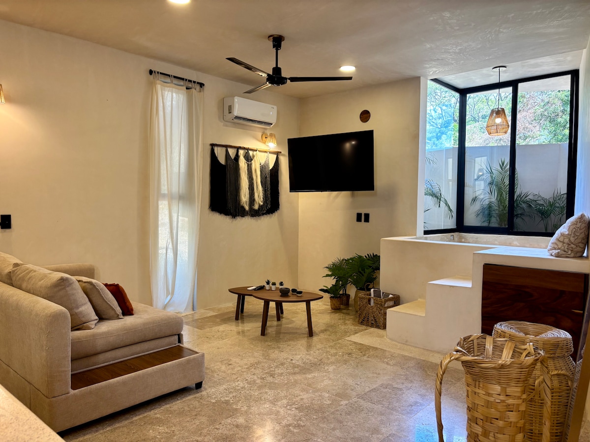 Acogedora suite con cama Queensize, Smart TV, Aire acondicionado, ventilador de techo, cocina, baño y jacuzzi privado. Disfrute de los atardeceres y relaje su mente mientras contempla la vista panorámica de la ciudad, el océano y las montañas desde su jacuzzi privado. Nos encontramos en Punta Zicatela, a 7 minutos caminando de la playa, principal punto de surf, restaurantes, bares y zona comercial. Cerca de todo, pero fuera del bullicio de la fiesta. Contamos con Internet Starlink.