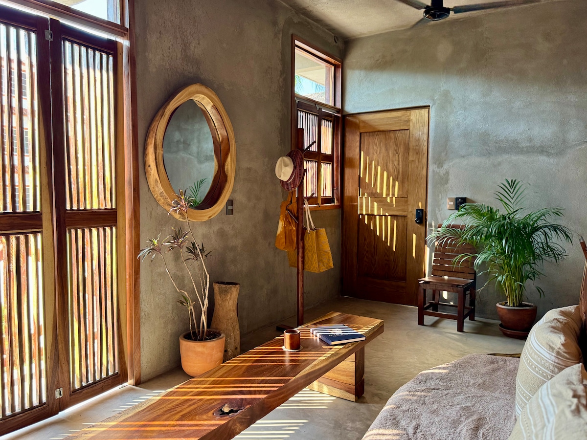 Depa amplio y luminoso en planta alta con 2 camas queen súper cómodas, A/C en la recámara y ventiladores en sala y cocina. Cuenta con cocina equipada, salita acogedora y balcón con vista a palmeras. Estás a solo 2 min de la playa y a 1 min de cafés, tiendas y restaurantes. Disfruta el patio compartido con hamacas, árboles frutales, asador y área de pesas artesanales. Ideal para relajarte, surfear o trabajar remoto con buena vibra.
