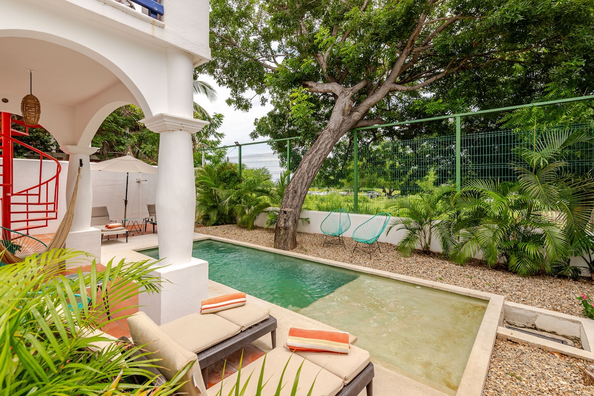 Depa amplio y luminoso en planta alta con 2 camas queen súper cómodas, A/C en la recámara y ventiladores en sala y cocina. Cuenta con cocina equipada, salita acogedora y balcón con vista a palmeras. Estás a solo 2 min de la playa y a 1 min de cafés, tiendas y restaurantes. Disfruta el patio compartido con hamacas, árboles frutales, asador y área de pesas artesanales. Ideal para relajarte, surfear o trabajar remoto con buena vibra.