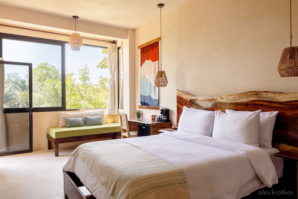 Discover Serenity on the 2nd floor in our king suite with an ocean view. Enjoy a cozy king bed with high-quality sheets, private bathroom, mini fridge & AC. Step onto your patio with hammock, embraced by pool and ocean vistas. Just 5-min walk to Playa Zicatela and by the new market. *Comfy king bed, premium sheets *Private bathroom *Refreshing pool, outdoor furniture *Mini fridge *AC, WiFi, TV *Spacious closet *Relaxing patio with hammock *Embrace local parota wood elegance