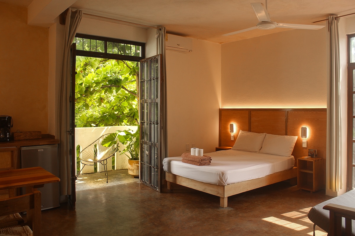 Private suite set inside a garden with a contemporary classic Mexican art deco style. Complete with a/c and it's own kitchen, bathroom, covered front and back decks, king size bed, hammock, outdoor seating / dining. Located at La Punta area of Puerto Escondido. Less than 10 minutes walk to beach & a very relaxed bar / restaurant strip. Spend your entire stay barefoot if you want! Fibre Optic internet! The house is on a property with a larger 5 bdrm house, also available under my profile.
