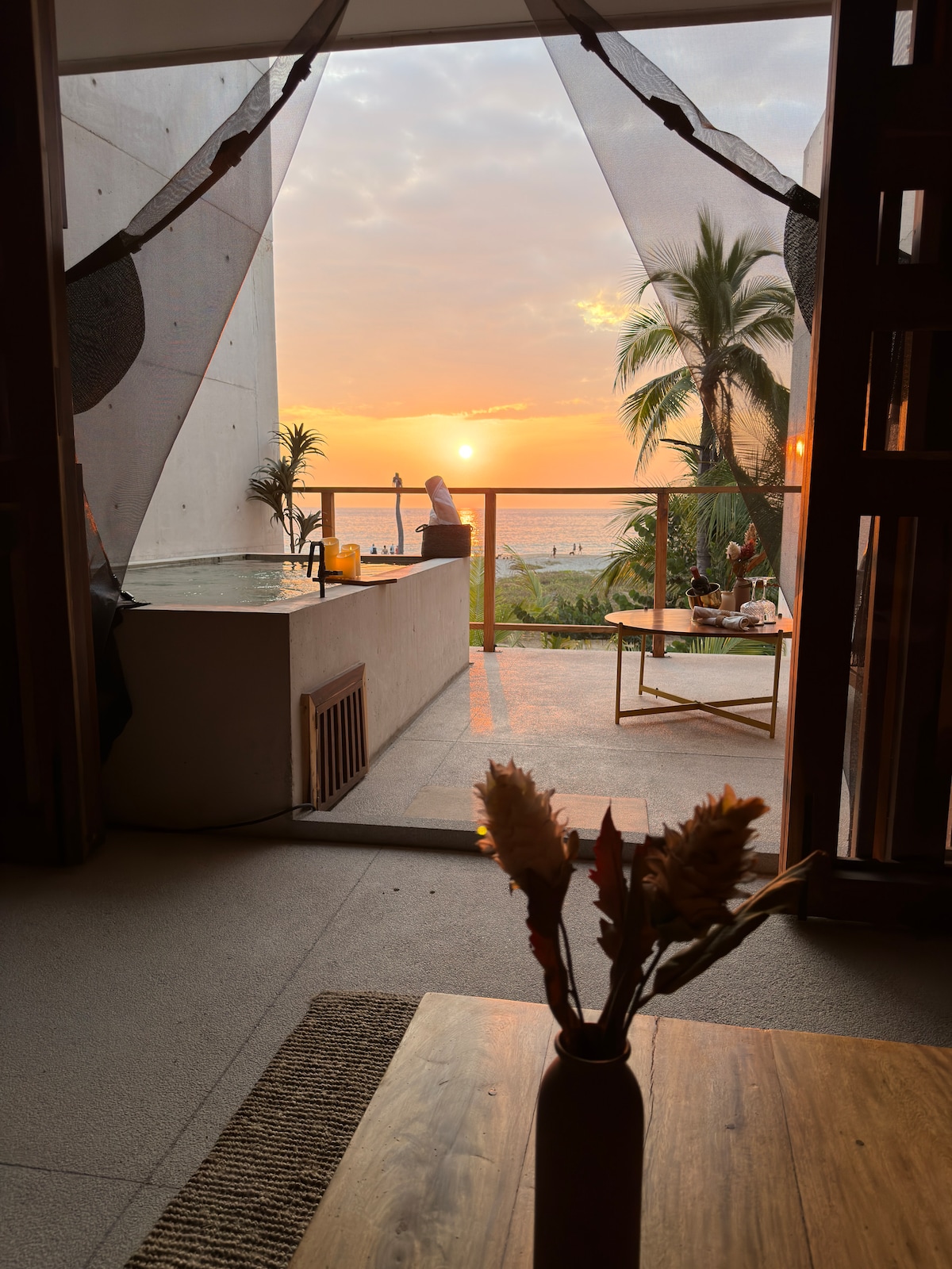 Acogedora suite con cama Queensize, Smart TV, Aire acondicionado, ventilador de techo, cocina, baño y jacuzzi privado. Disfrute de los atardeceres y relaje su mente mientras contempla la vista panorámica de la ciudad, el océano y las montañas desde su jacuzzi privado. Nos encontramos en Punta Zicatela, a 7 minutos caminando de la playa, principal punto de surf, restaurantes, bares y zona comercial. Cerca de todo, pero fuera del bullicio de la fiesta. Contamos con Internet Starlink.