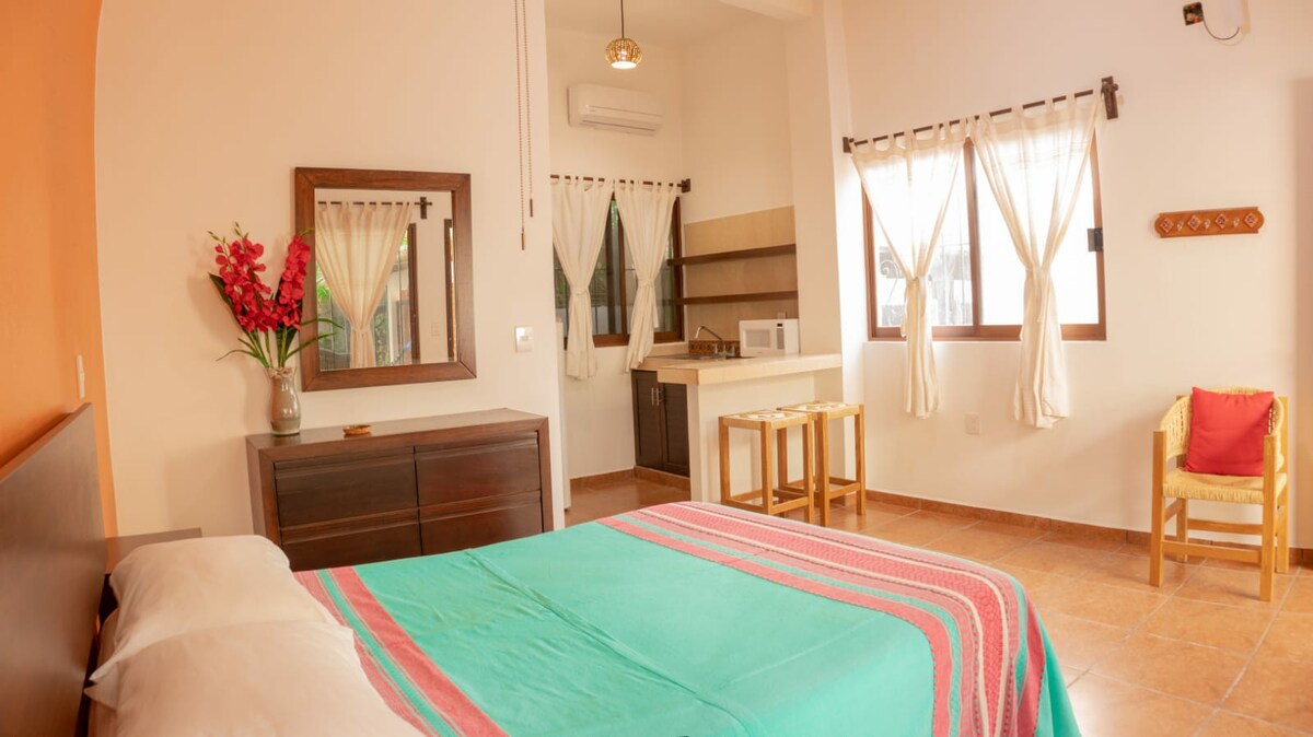 La habitación estándar está en planta baja, ofrece un espacio cómodo, fresco y tranquilo, ideal para descansar o trabajar remoto. Su diseño contemporáneo y tropical, crea una atmósfera relajante perfecta para una estancia agradable. Cuenta con cama queen size, A/C, ventilador, TV, WiFi, baño privado, frigobar y cafetera Nespresso. Como huésped podrás disfrutar de las áreas comunes como la alberca, camastros, mesas, cocina equipada, estacionamiento y circuito de vigilancia.