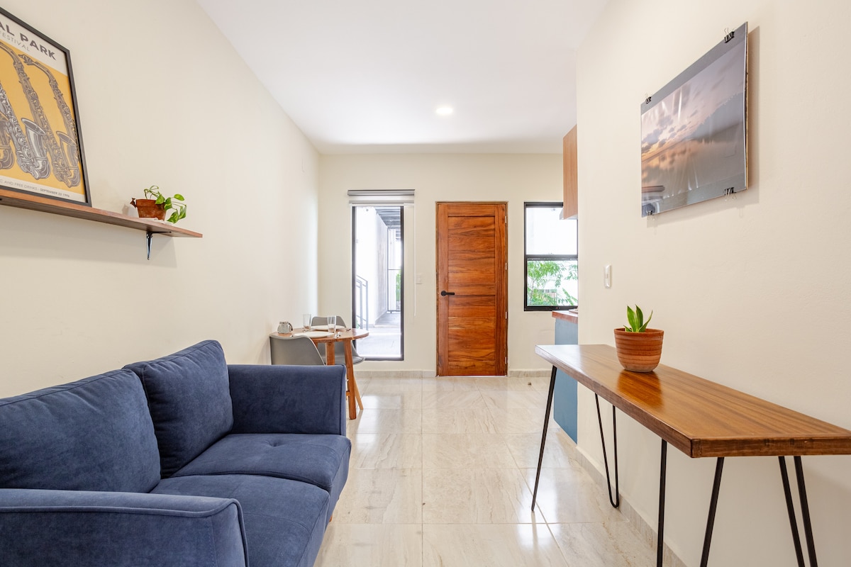 Comfortable apartment for 4 people. In a building specifically designed for tourism. Equipped gym, roof with pool, elevator, green areas, lobby and coworking area with high speed internet. Enjoy Playa del Carmen in one of the quietest areas of the city. In front of the "La Ceiba" cultural park and just 8 minutes from the beach. If what you are looking for is a quiet and well located place in Playa del Carmen, this is the option!