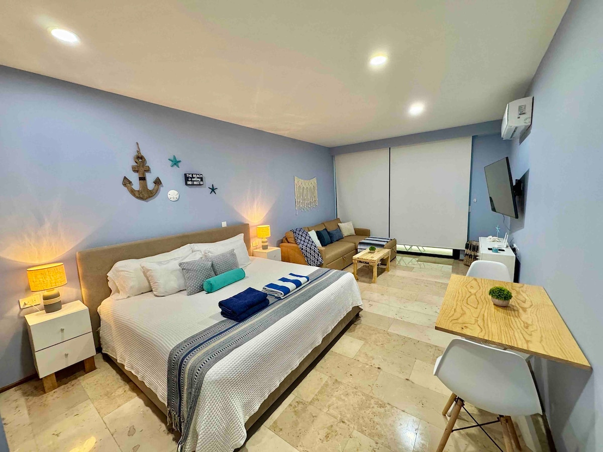 Stay close to the heart of Playa del Carmen! This stylish studio for 3 adults features a king bed, sofa bed, full kitchen, dining area, AC, WiFi, Smart TV, and a private balcony. Just 2 blocks from 5th Ave and 3 blocks from the beach and ferry to Cozumel, located right under the iconic Paseo del Carmen plaza. Enjoy top amenities like a rooftop with ocean views, infinity pool, jacuzzi, gym, business center, 24/7 security, elevator, and underground parking. High cleaning standards.