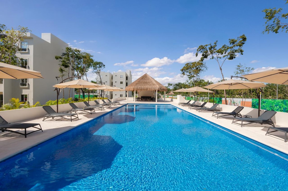 Welcome to your private oasis at AWA in Playacar. - Ultra-comfortable 2-bedroom, 2-bathroom apartment - Private terrace overlooking the pool - Huge 150m pool with built-in bar - Gym, paddle court, and massage room available - Children's club and play areas - 24-hour reception service - 10-minute walk to Playa del Carmen's beautiful beaches - Nearby attractions: Xcaret Park and Quinta Avenida Do you dream of escaping to a unique place, combining luxury, comfort and privacy?