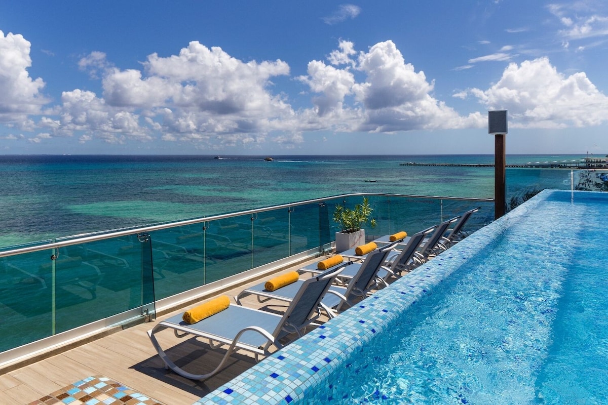 Master suite con vista panorámica al mar caribe y rooftop privado con alberca de inmersión, dos camastros, sala lounge y regadera. Tiene una cama King size, sofá cama y balcón con vista a la playa, proyector de video con aplicaciones streaming y un sistema de sonido. Cuenta con una cocina moderna con estufa eléctrica, refrigerador, microondas, tostadora, cafetera y tetera, con oferta de tés y cafés. Servicios incluidos como free-wifi, toallas de playa, secador de pelo, caja de seguridad.