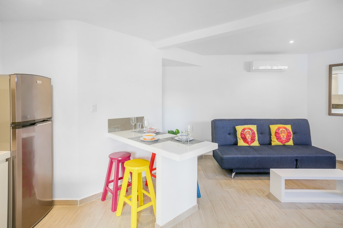 Lovely 1 Bedroom, all furhished and equipped for 6 (PAX) with 2 nice common pools area, Jacuzzi, BBQ, A/C, Gym, Security 24/7, Parking, just steps from 5th AVE and 2 Minutes walk to the famous Mamitas Beach ... the tranquility of the Mexican Caribbean. Great option for who is looking for a place safe in the downtown, the beach, Supermarkets, cafés, stores, artisan shops and also in a quiet Condominium in the heart of Playa del Carmen. Guests will have immediate attention 24/7.