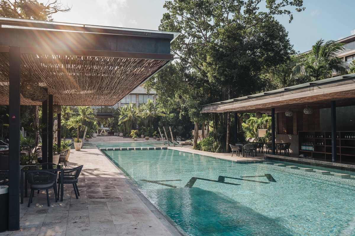 Experience luxury at AWA in Playacar, a tropical retreat blending comfort and nature. - 3 suites with private bathrooms - Spacious living room with large bay windows - Private rooftop with jacuzzi and barbecue - 150 m swimming pool with bar and hammocks - Adults-only rooftop with two pools - Modern coworking space - 24-hour reception and security