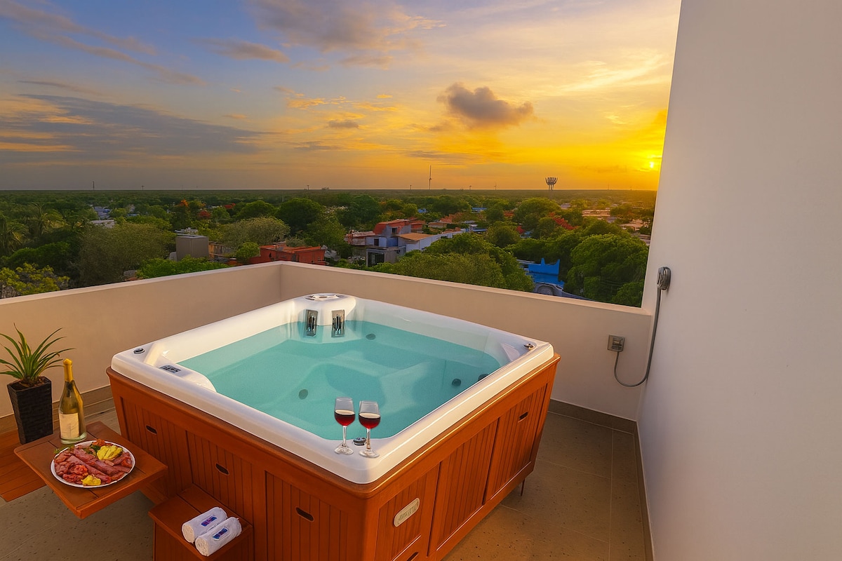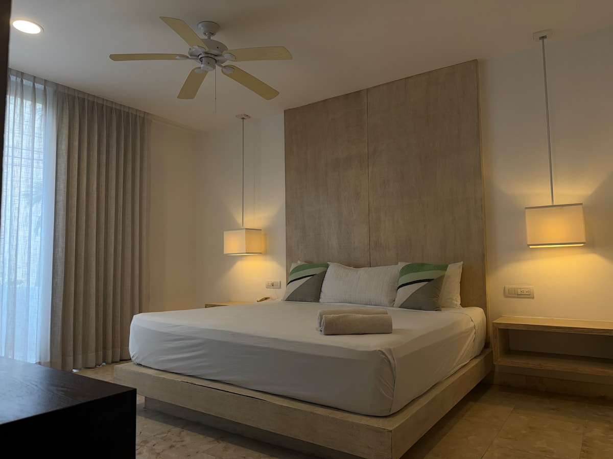 🪻A solo unos pasos de una de las playas más exuberantes y de la 5ta Avenida, este moderno departamento te brinda una experiencia sin precedentes. Reposa en una cómoda cama king, disfruta de tus pelis favoritas en Smart TV y explora tu creatividad en una cocina práctica y funcional. 🌿Disfruta de tu espacio al aire libre en un balcón privado. Y si buscas algo más especial, sube al rooftop: ahí te esperan una infinity pool, la vista parcial al mar y el radiante sol del Caribe.