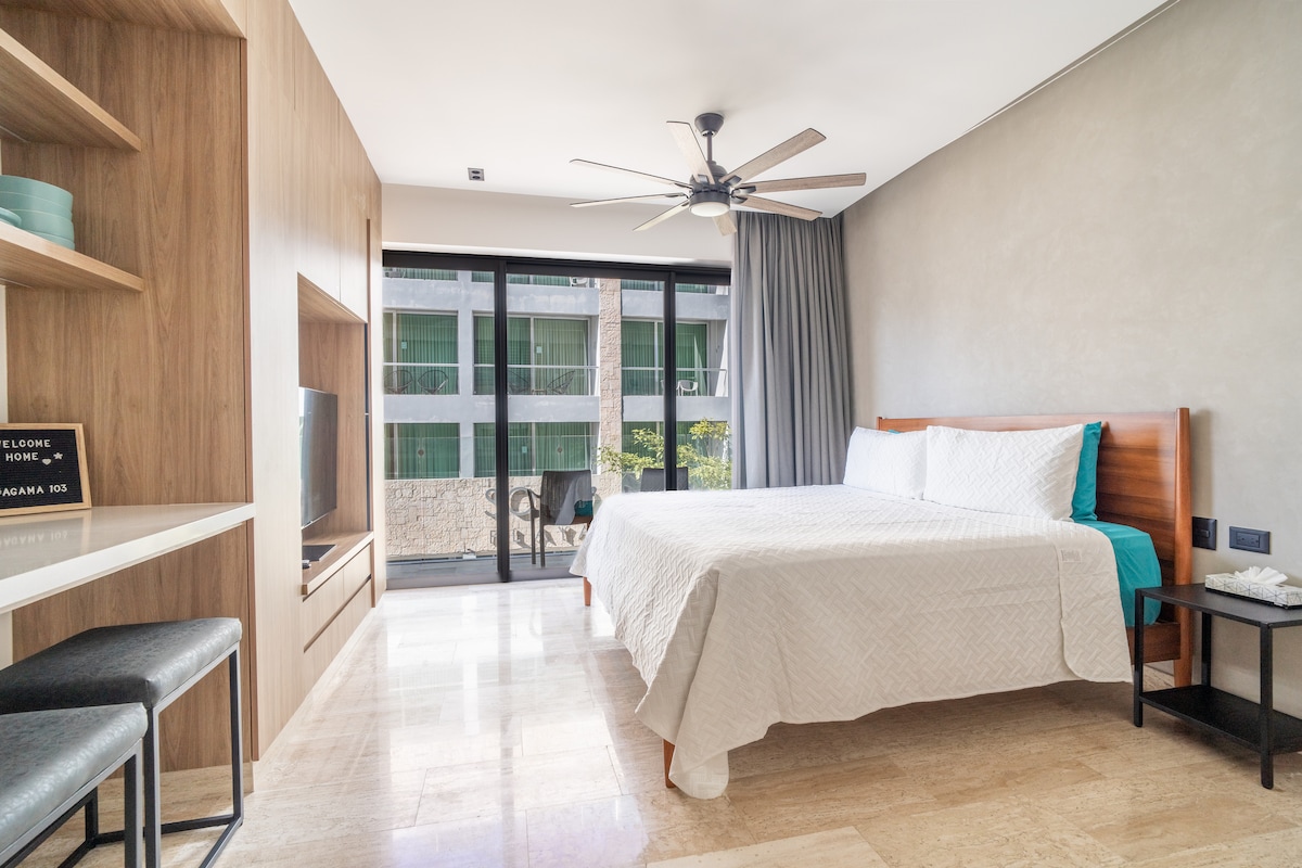 Wake up to 20-foot floor to ceiling windows overlooking the lush courtyard and walk upstairs to your private daybed and jacuzzi on your rooftop terrace. The building has a private complete gym, 12 resistance training machines, free weights up to 90lbs with adjustable benches, cables, smith machine, speed bike, and 2 ellipticals. There is a common area pool, three jacuzzis, a rooftop bar and moonlight theatre. Centrally located, Anah Playa is walking distance to everything in town.