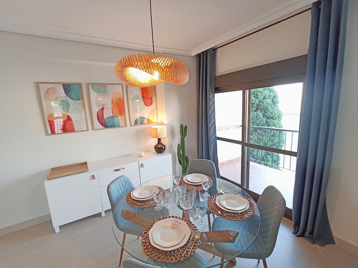 This spacious, bright, cozy and comfortable apartment located next to the beach offers wonderful views of the sea and the entire coast of Malaga. It is located in a huge complex with 120.000^2 of gardens, swimming pools, tennis and paddle courts, mini golf, restaurants. Nearby you can find supermarkets, stores, pharmacy, entertainment, leisure and sports activities. Its excellent location and good connection allows you to combine relaxation with leisure and culture.