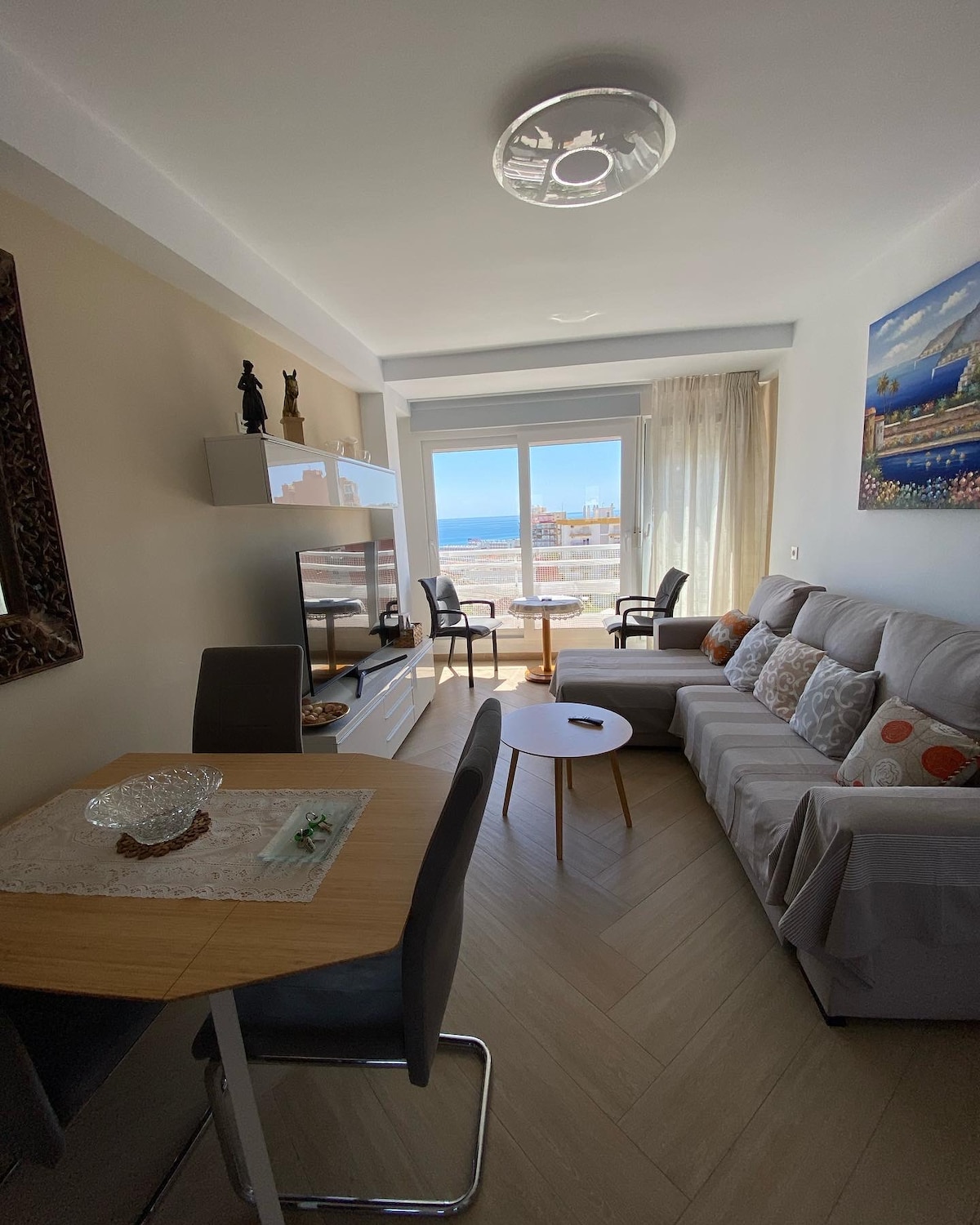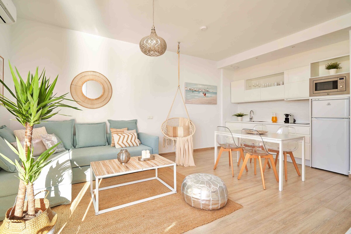 'HOME' AWAY FROM HOME How home should feel: A brand new fully renovated apartment with all amenities needed. At a 4 min walk away from the beach and 10 min walk away from the train station (Montemar Alto). Flat located on the 2nd floor with elevator facing the interior garden and the pool and peaceful surroundings. Fully equipped new kitchen, 1 terraces, AC units in all rooms and a new designer bathrooms, FREE WiFi and TV 4K with SmartTv