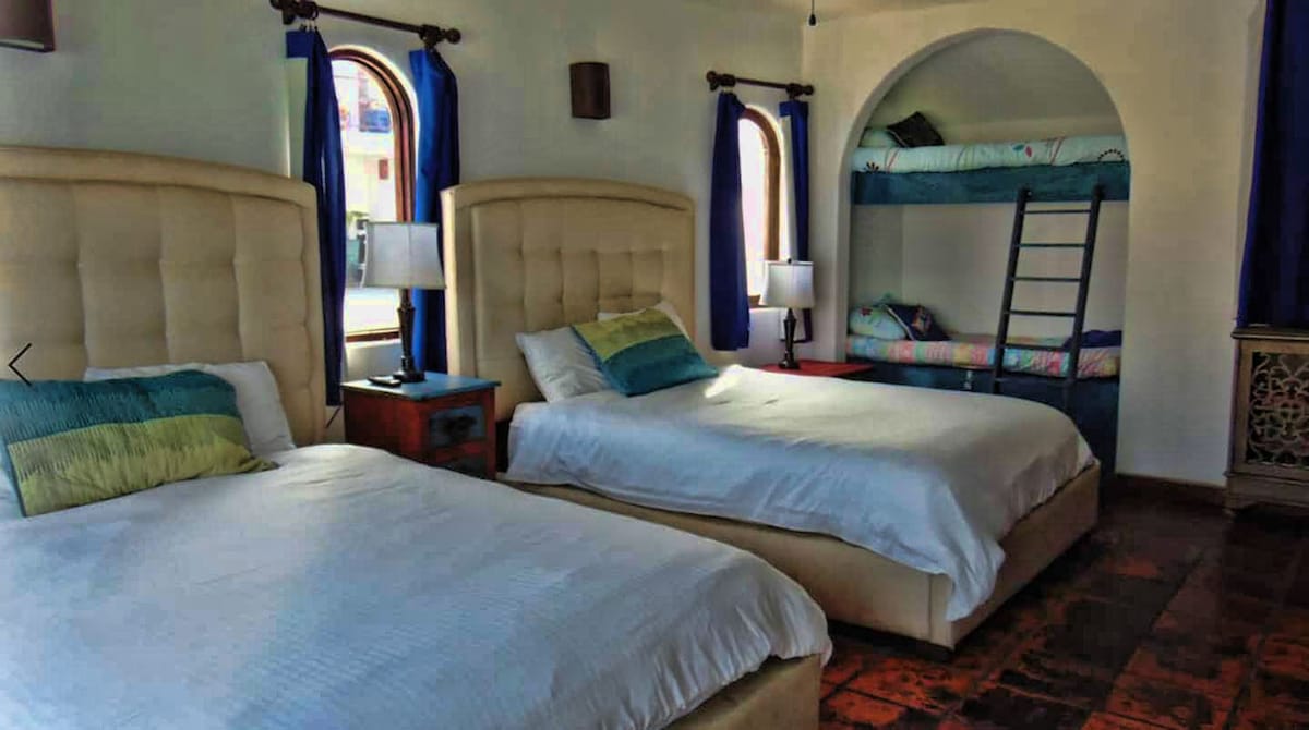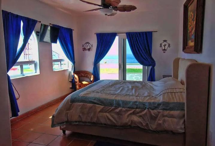 This unique property 20 miles south of Rosarito sits on the Baja coast inside one of the area's premiere gated communities. Just 1 mile north of Villas Paraiso, the 4-story beach home provides 3 separate guest suites on the 1st floor just off an outdoor kitchen/patio with a large (huge!) blue-tile fountain. The Blue Casita includes satellite TV, a ceiling fan, AC, a phone, a radio, a private bath, and a kitchenette. To enjoy ocean views and a lounge, guests take the elevator to the 4th floor.