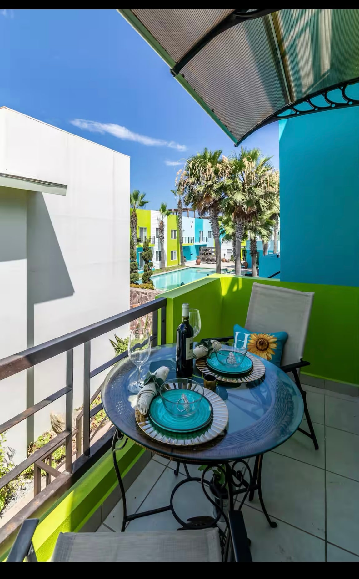 Spacious studio apartment in multi-level beach house in San Antonio Del Mar, 3 blocks from the beach. Living room, kitchen, & laundry inside. Dining room for 4, private deck with additional dining area, and shared rooftop deck with grill, fire pit, and gorgeous ocean views. Fine artistic touches; custom wrought iron, vibrant murals. urban coexistence. Secure and gated community, 24/7 security, shared swimming pools, tennis courts and park with playground. Hi speed WIFI. Sleeps 4.