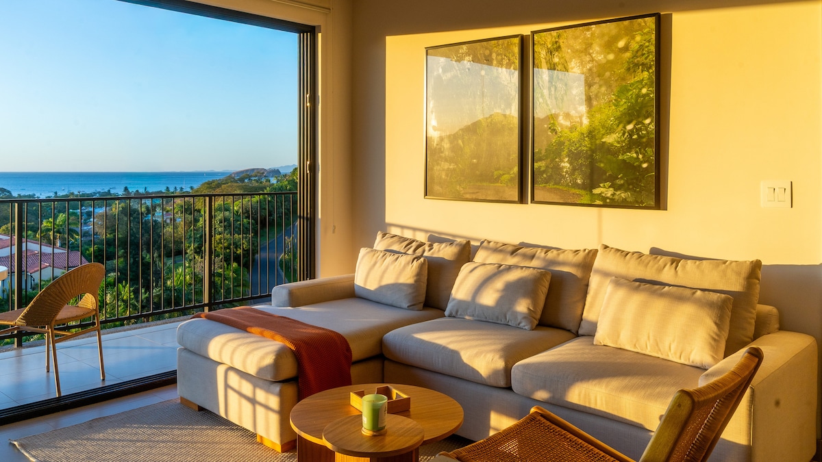 Enjoy a luxurious and unforgettable stay at our stunning 2-bed, 2-bath condo, featuring breathtaking ocean views. Both bedrooms offer premium bedding for a peaceful night's sleep. The dining/living area is bright and spacious, furnished with modern decor that exudes an airy atmosphere. Step onto the scenic balcony and soak in the magnificent views of Playas del Coco. Please note that the condo is located on the second floor, there are about 40 steps to access the unit with no elevator.