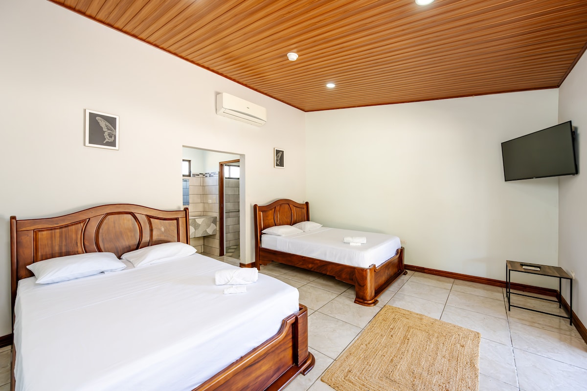 Imagine a luxurious family retreat nestled in Potrero, Costa Rica, offering a perfect balance of comfort and sophistication. The spacious room is adorned with sleek, natural finishes that reflect the region's tropical charm, such as teak wood accents and soft earth-toned décor. A large king-sized bed sits in the room, inviting restful nights after adventurous days. The room is cooled to your preference with efficient air conditioning, providing a refreshing escape from the warm Costa Rican sun.