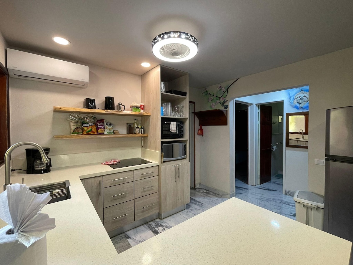 Immersed in nature, this is a brand new stylish and modern unit. Detailed with an exclusive rustic touch, we offer a unique dine and wine experience in our magical treetop terrace. Located downtown, yet in a quiet neighborhood, you will find yourself 5 minutes away (walking distance) from the pristine beach of Tamarindo. 2BR / 2BA, AC, fully equipped kitchen, terrace, outdoor treetop dining experience, free parking on premises. Take it easy at this unique and tranquil getaway.