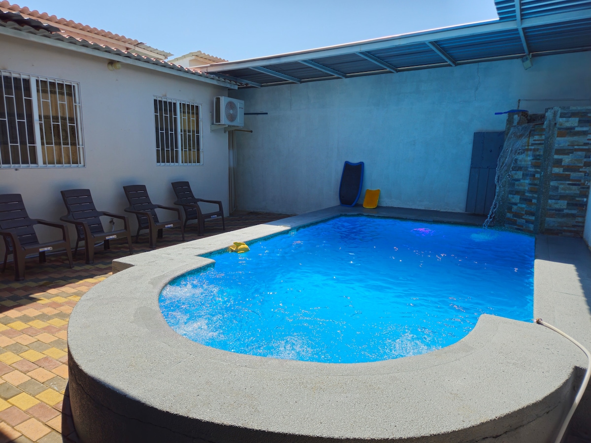 Located in Playas Villamil, three blocks from the beach and 0.5 km from shops and restaurants. The villa offers six bedrooms, each with a private entrance and air conditioning. Five rooms include a private bath, hot water, hair dryer, iron, shampoo, soap, and lotion. Guests enjoy exclusive access to the pool and cabana, Jacuzzi, bar, barbecue, and spacious outdoor area. The villa also features a full kitchen with an oven, stove, microwave, cookware, dishes, and utensils.