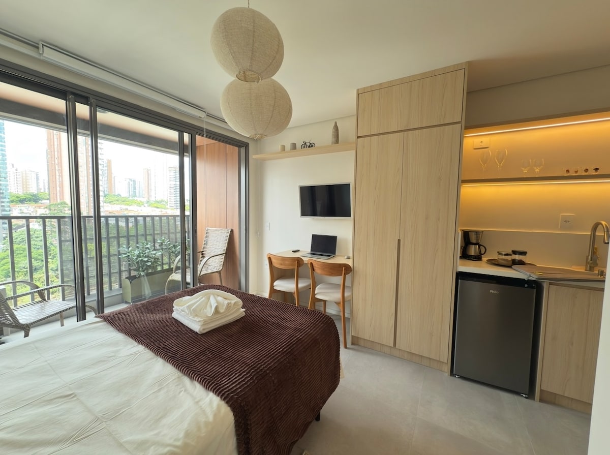 Welcome and make yourselves at home. The apartment is brand new, designed especially for you and has impeccable decor, very practical for everyday life. The view is spectacular! The apartment is on the 28th floor. We are in an excellent location in São Paulo, in the Pinheiros neighborhood, with restaurants, supermarkets and bakeries very close by. It's 40m2 (430 sqft) with 1 bedroom and 1 bathroom. Walking distance from Fradique Coutinho subway station (just 2 blocks).