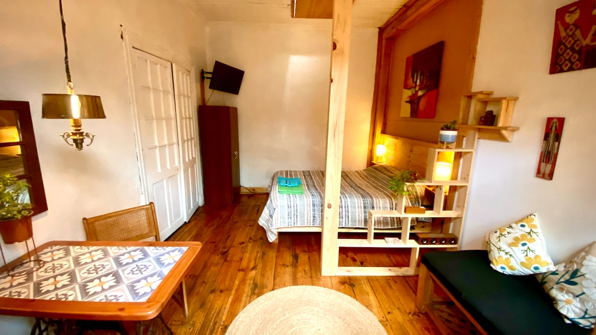 Encántate en nuestro departamento estudio cercano al centro histórico de Santiago pensado en tonalidades del sur de Chile. Disfruta de todas las comodidades de este alojamiento silencioso y completamente equipado para que tu estancia sea lo más confortable posible. A pocos minutos a pie del metro Línea 5 (5min) y Línea 1 (8min) para movilizarte más fácilmente por la ciudad. Estudio 1 hab. 1 b y terraza Si requiere Parking podemos alquilar 1 lugar al interior de las instalaciones del condominio.