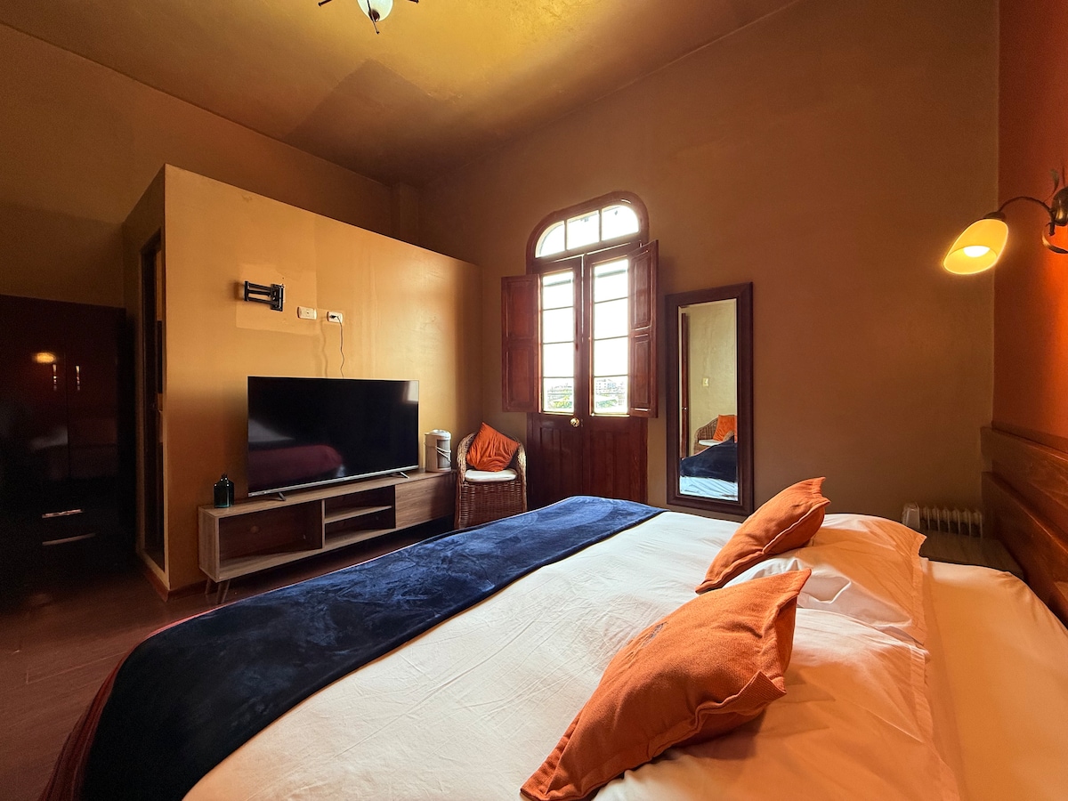 Disfruta de una acogedora habitación con cama Queen, equipada con un colchón confortable, ropa de cama de calidad y una decoración que combina lo andino con lo clásico, creando un ambiente cálido y autentico. Cuenta con baño privado, agua caliente, tv cable, wifi para tu comodidad. La habitación está bien ventilada con ventanas amplias, vista al patio interno, hecho de sillar volcánico único y autentico, y con detalles pensados en ti y una atmósfera que invitan al descanso placentero