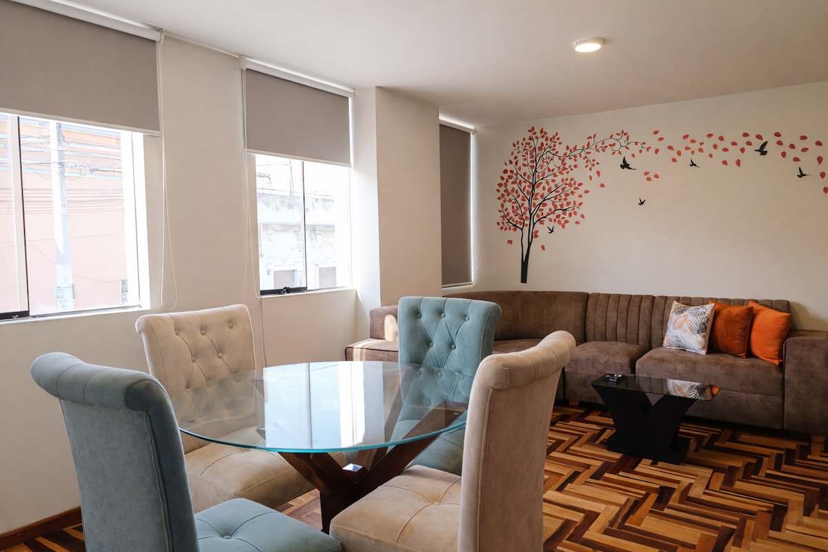Refúgiate en este mini apartamento céntrico y elegante, a muy pocas cuadras de los mejores restaurantes y bares de la ciudad. Diseñado para ofrecerte la máxima comodidad y relajación, con ventanas herméticas que aislan del ruido y polvo de la calle. Ubicación privilegiada, a tan solo dos cuadras de la Catedral de Arequipa y a media cuadra del Monasterio. Podrás conocer todo el centro histórico simplemente caminando. Contamos con un balcón con sombrilla muy agradable ! Netflix incluido !