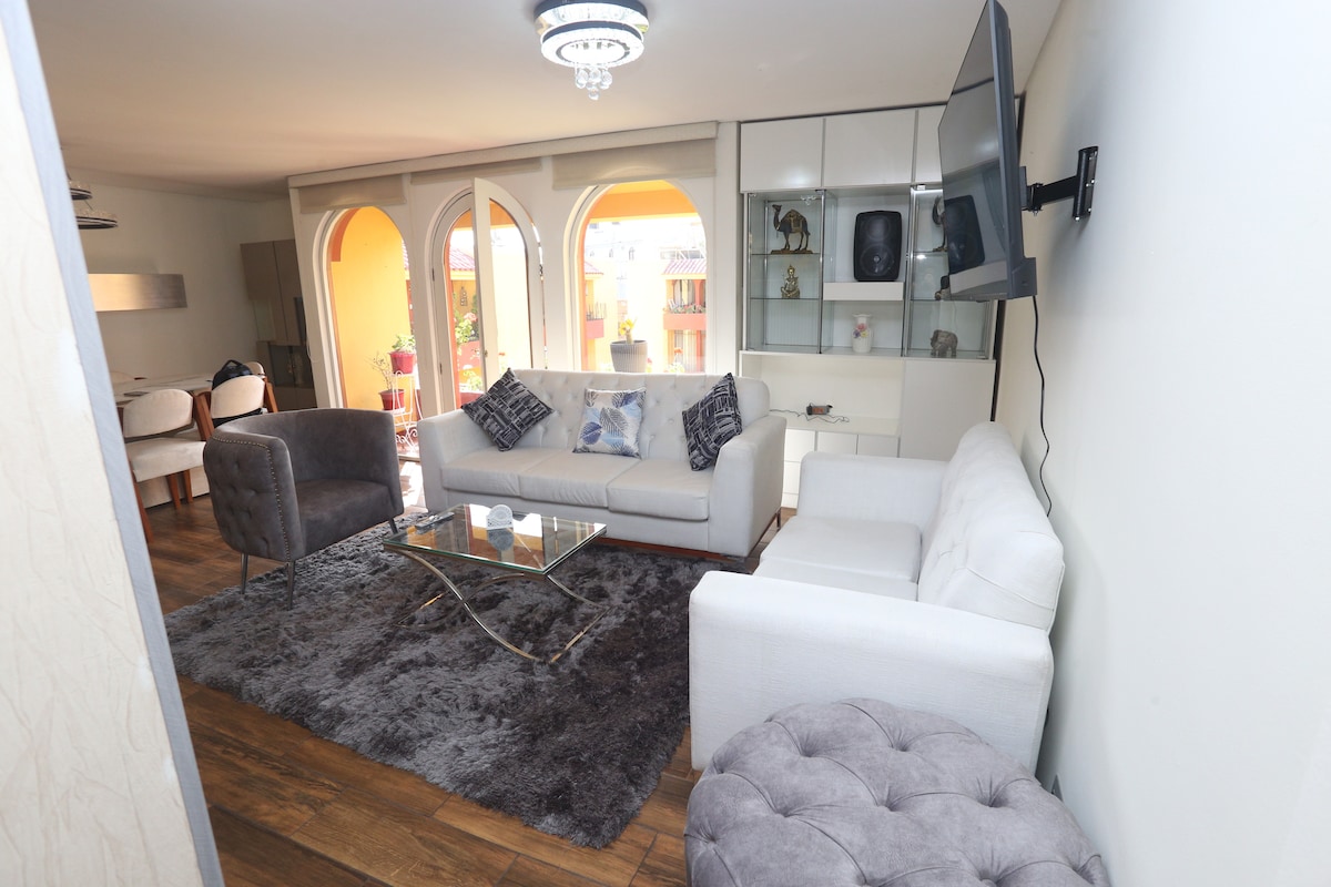Consta de una sala con TV de 65” NETFLIX para su total distracción, además tiene un equipo de sonido para su comodidad. Un comedor, una cocina equipada con artefactos y menajeria completa para su estadía. Tiene tres dormitorios c/u cama 2 plazas, televisores Smart en c/u y mesas con sillas, con ropero empotrado uno de ellos tiene un baño privado y los otros 2 con baño compartido. Cuenta con cochera. Tiene agua caliente todo el día y una buena señal de WIFI. Cuenta con acabados de primera.