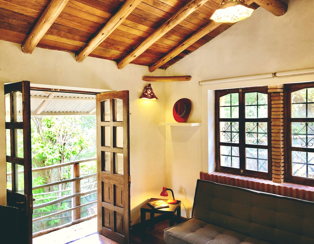 Warmth & Calm in our rustic style flat with eucalyptus trunks and wooden floor, designed with colonial furniture and handcrafted beauty in every space Wake up to the singing of birds in our room with wardrobe, 55' SmartTv with cable & Netflix Nice balcony with comfortable armchairs to read a book with a coffee and a view of the mountains and garden Airbnb equipped with everything you need for a comfortable stay, kitchen stocked with basic products and extractor hood