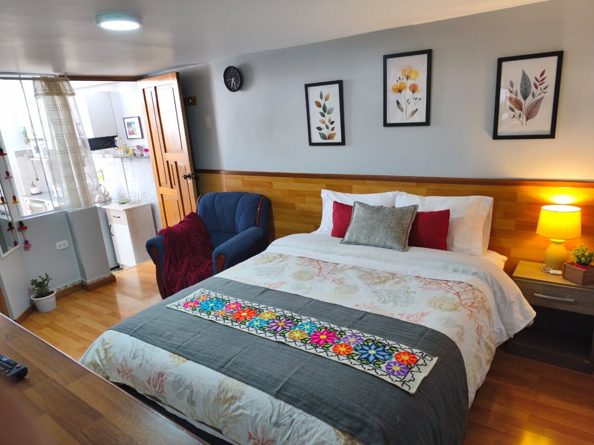 Disfruta de una experiencia con estilo en este alojamiento céntrico. Loft ubicado en el hermoso barrio tradicional de San Blas, un espacio diseñado para tener una buena estadía, cómoda, segura y céntrica. Carmen Bajo una calle pintoresca, con lugares para disfrutar una buena comida y algo de música ; San Blas es un barrio lleno de tradición y cultura ubicado en el centro del Cusco. Visita nuestros departamentos Tierra Bella FYI: cocina y ducha eléctrica