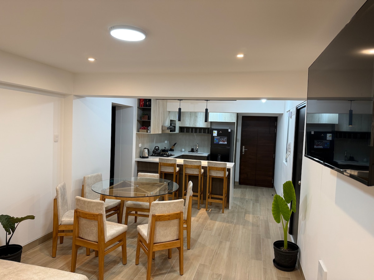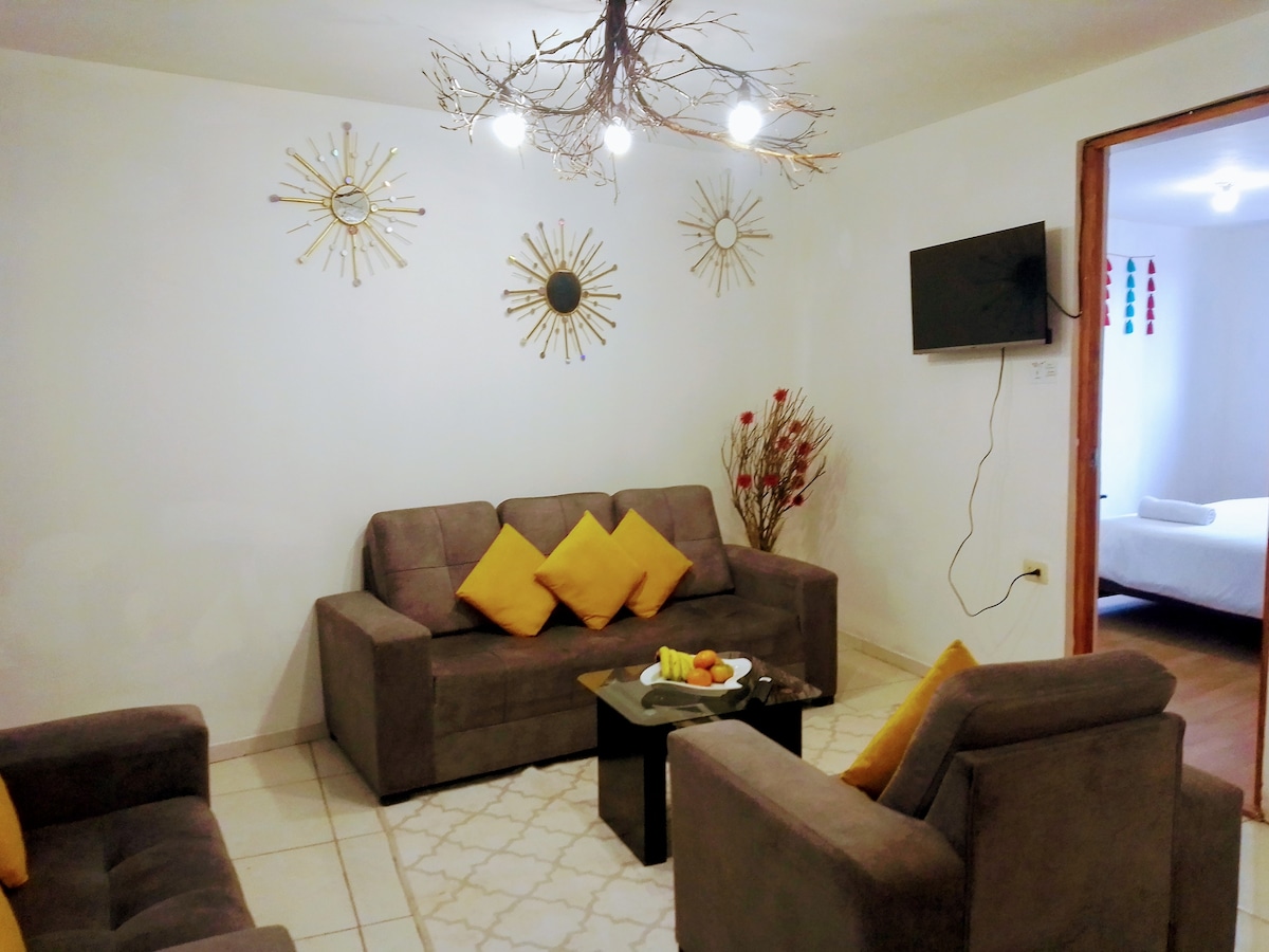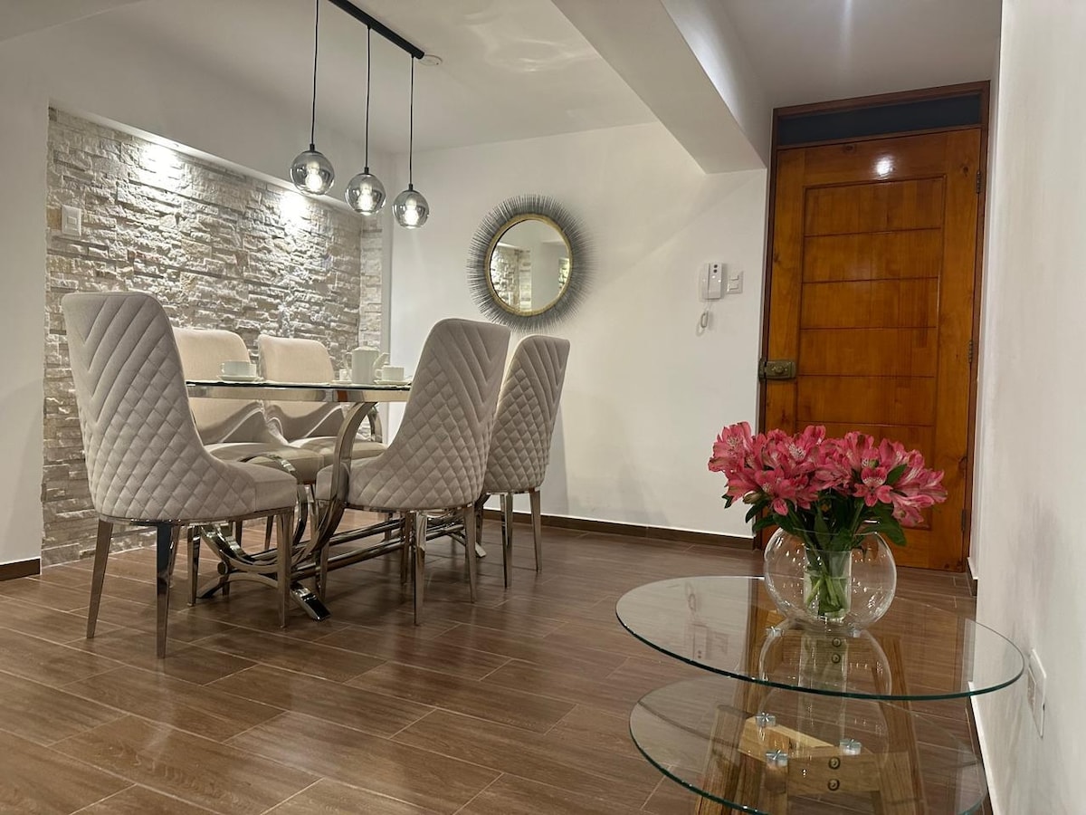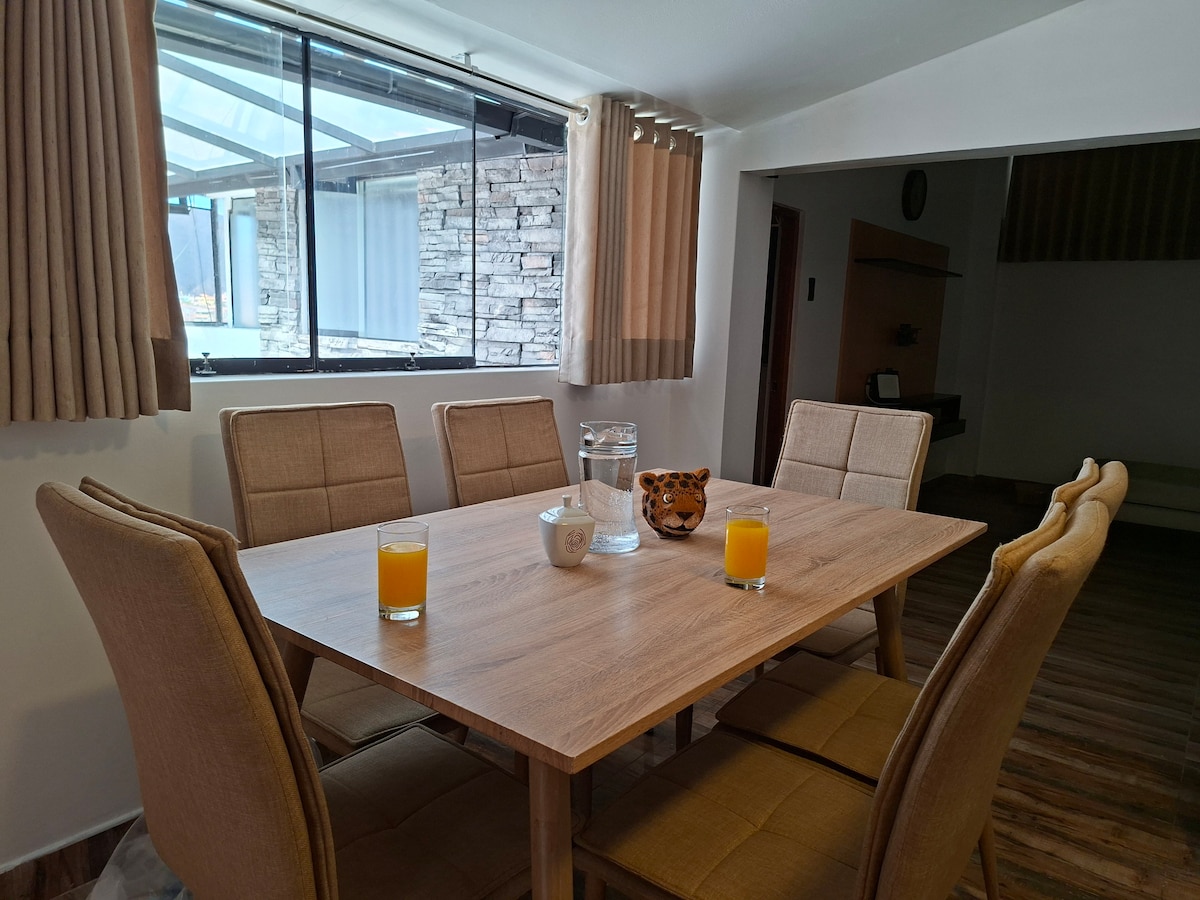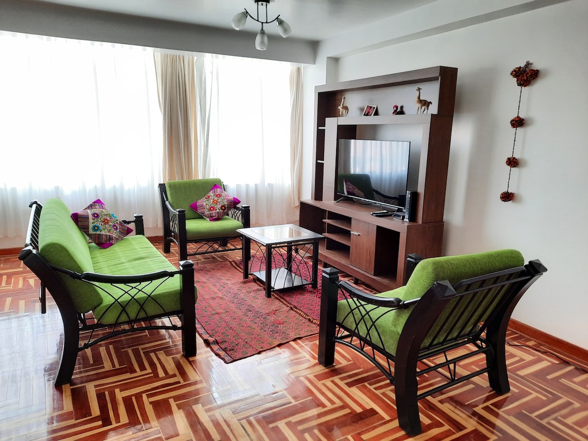 Hermoso y amplio apartamento con vistas espectaculares a la espalda de la Catedral, totalmente amoblado, en el centro de la ciudad, a media cuadra de la Plaza de Armas, con dos dormitorios uno con cama king que se puede convertir en dos camas, la otra con una cama queen con televisor smart, dos baños completos, sala super amplia con tv smart, comedor, cocina totalmente equipada con cocina, refrigeradora, microondas, licuadora, cafetera, ollas, platos y cubiertos, wifi.