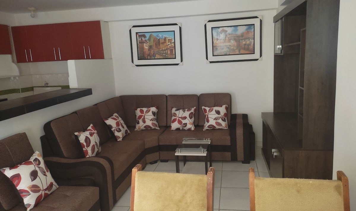 El depártamento se encuentra ubicado en el tercer piso y cuenta con sala, comedor, cocina , zona de entretenimiento y lavanderia y cuenta con 2 dormitorios, todo el departamento tiene luz natural a los dormitorios con ventanas amplias , el departamento es independiente y amoblado, el dia que arrivan a cusco les recojemos del aeropuerto o terminal terrestre para trasladarlos y darles las llaves . pueden hacer uso de la terraza que tiene una linda vista de la ciudad.