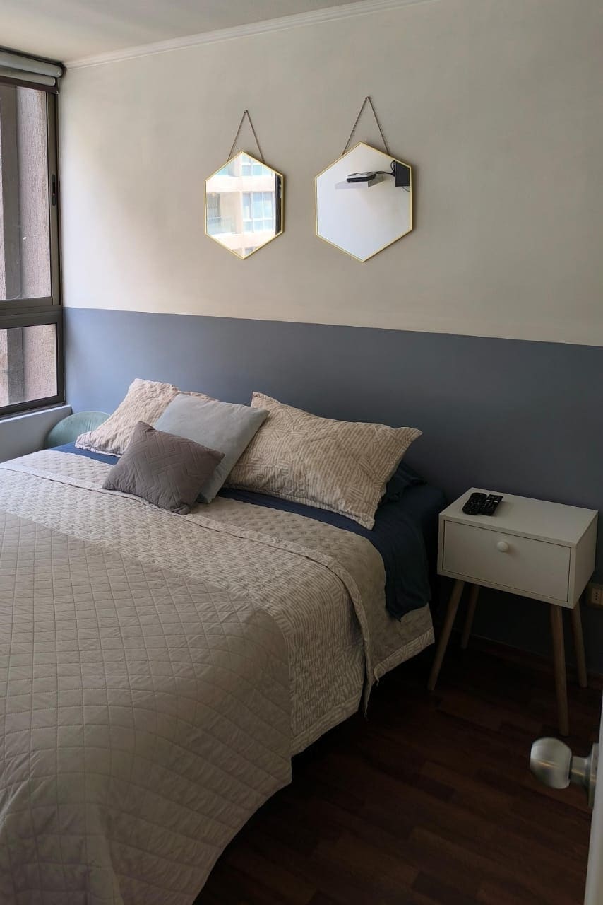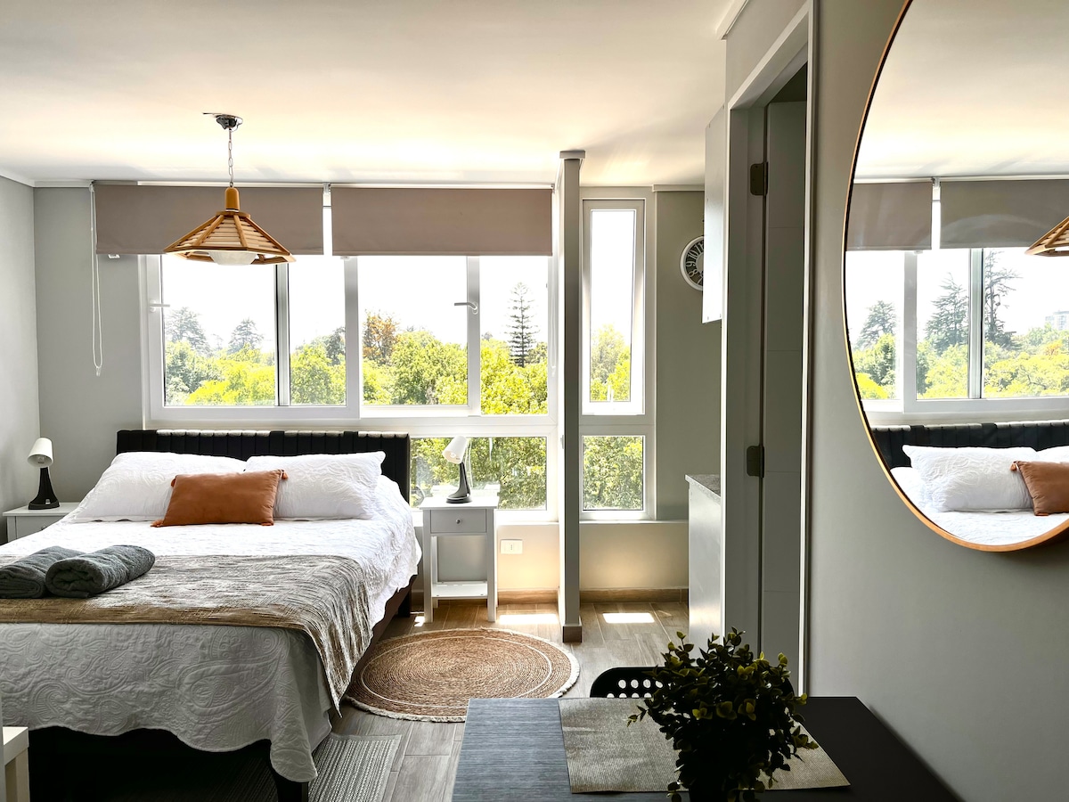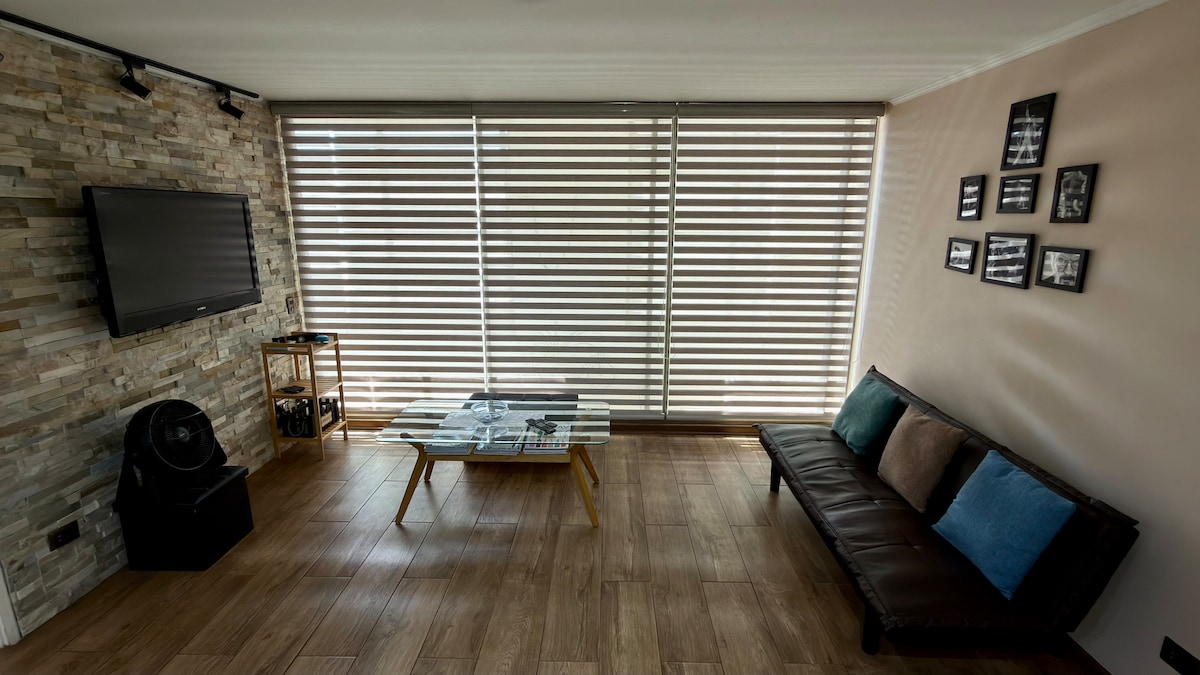 Moderno y acogedor departamento con aire acondicionado en el corazón de Santiago. A pasos del metro y del Centro Histórico, rodeado de museos, mercados y restaurantes. Cama king, cocina equipada, balcón y wifi rápido, ideal para viajes o estadías largas. Edificio seguro con conserje 24/7. Atención personalizada, check-in flexible y recomendaciones locales para que disfrutes la ciudad como un residente, con comodidad y tranquilidad.