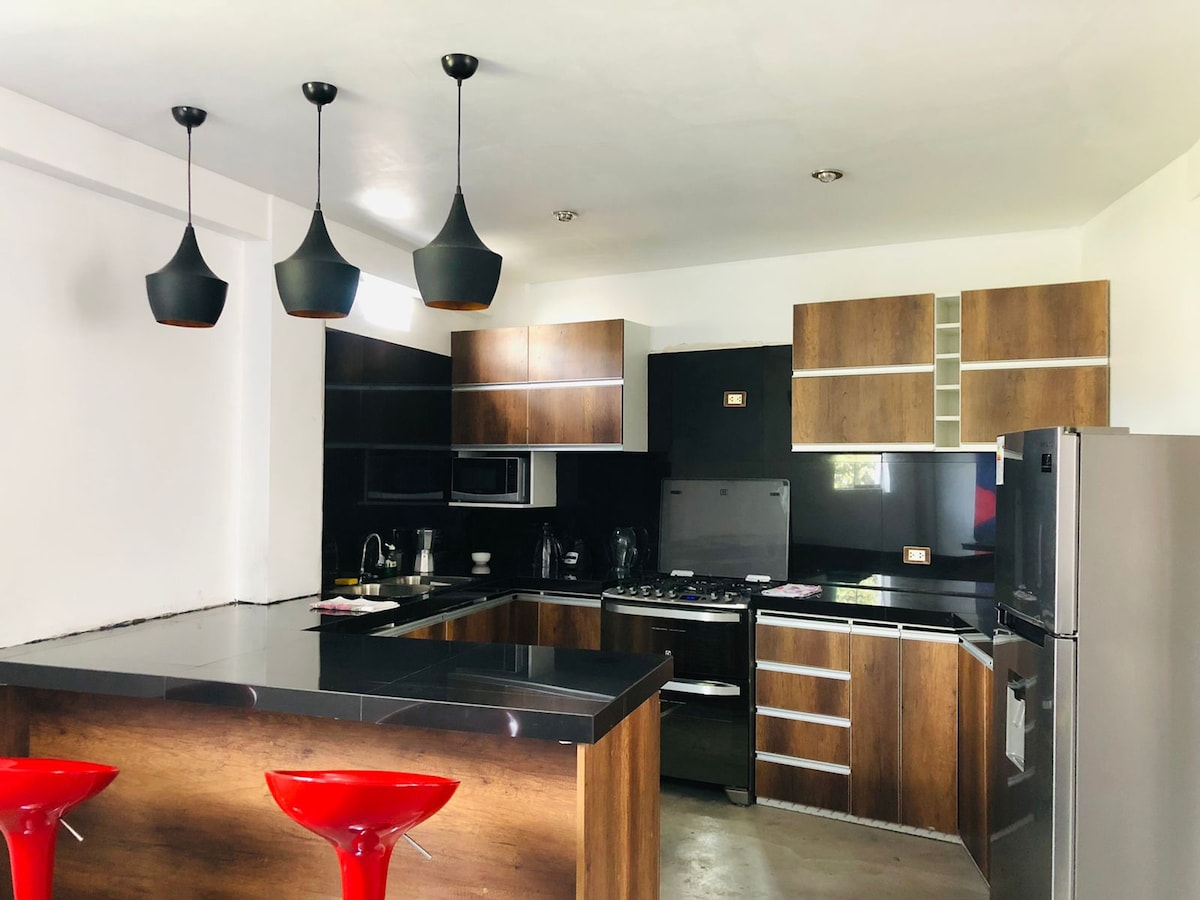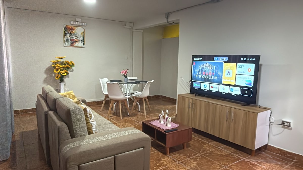 ¡Disfruta la comodidad de nuestro apartamento en zona tranquila y segura! Este bonito departamento está ubicado en el tercer piso ofrece 2 habitaciones con cama de 2 plazas, se puede agregar una cama adicional si se necesita, una sala con sofá y smart TV, 2 baños, agua caliente y una cocina totalmente equipada, cochera incluida durante toda su estadía. Está a 5 minutos del aeropuerto, restaurantes, markets y a 10 minutos del centro de la ciudad. ¡Reserva ahora para una experiencia inolvidable!